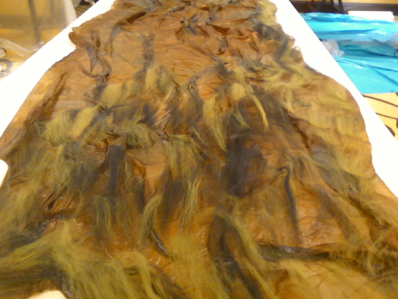 3) Then laid out thin layers of wool over the silk and gently rubbed using soapy water to felt the wool to the silk.