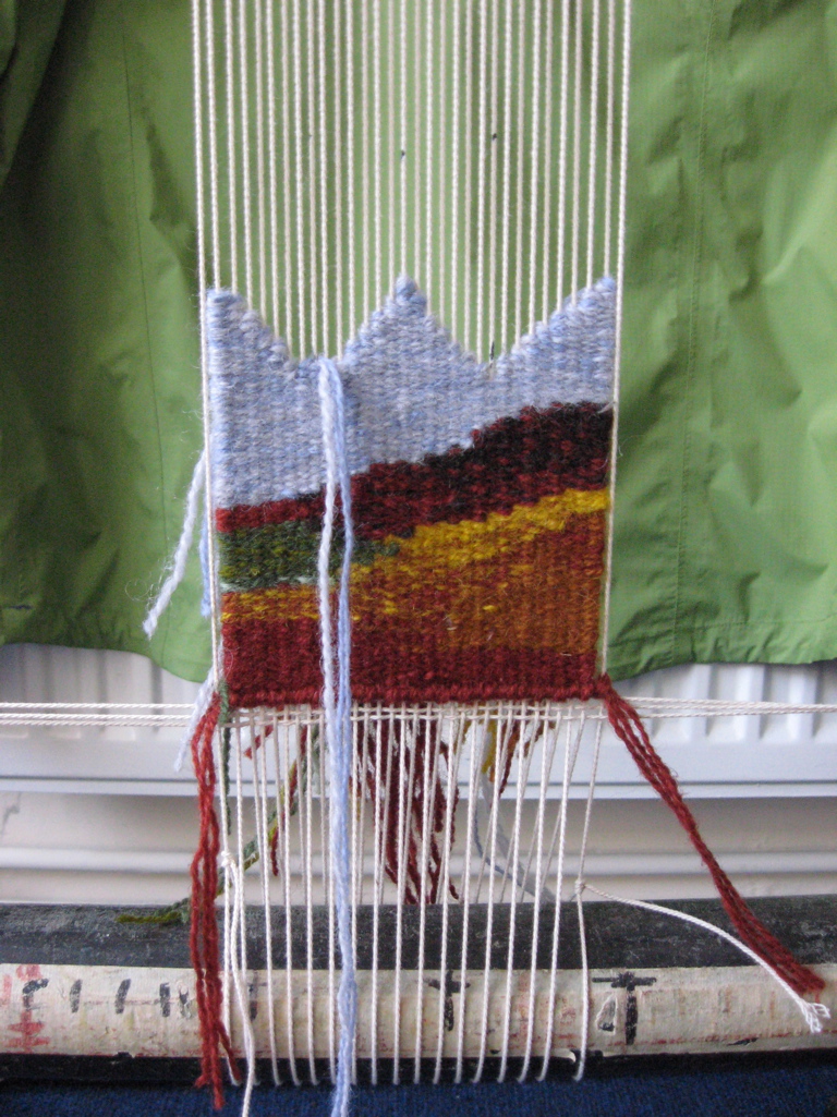 Wednesday, I continued working on the landscape. One of the techniques tapestry weavers have used for centuries when weaving a large space that’s basically a solid color is to weave a shape rather than simply going straight across. This breaks the monotony and gives some texture and interest to the weaving. We had seen this technique used in some of Alastair’s work and I wanted to give it a try.
