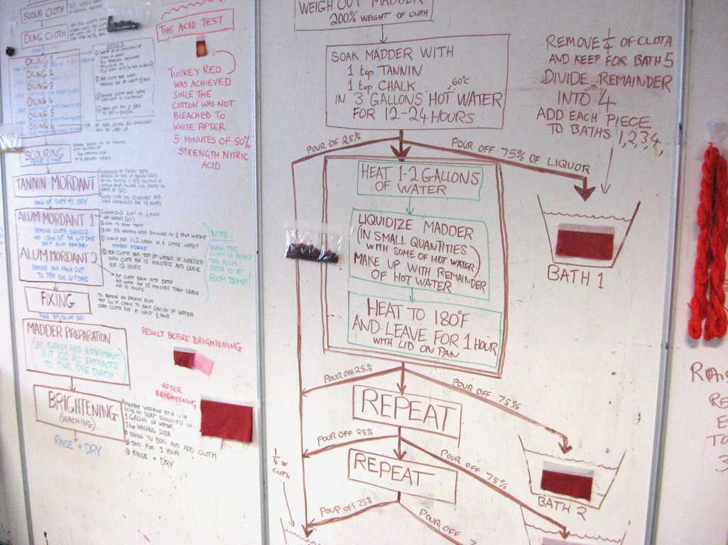 One of the best things about summer school is the ‘Walk About’ on Saturday afternoon.  This is when we all get a chance to see what everyone else has been doing all week.  It’s always a bit of a scavenger hunt adventure to find them all and this year was no different = 16 courses were held in 6 different buildings spread over the entire campus!  Turkey Red Dying won the prize for most creative dirctions by using ‘Follow the String’ to lead us through a labyrinth of hallways, in and out of the building (due to wet paint!) until we arrived at their location.