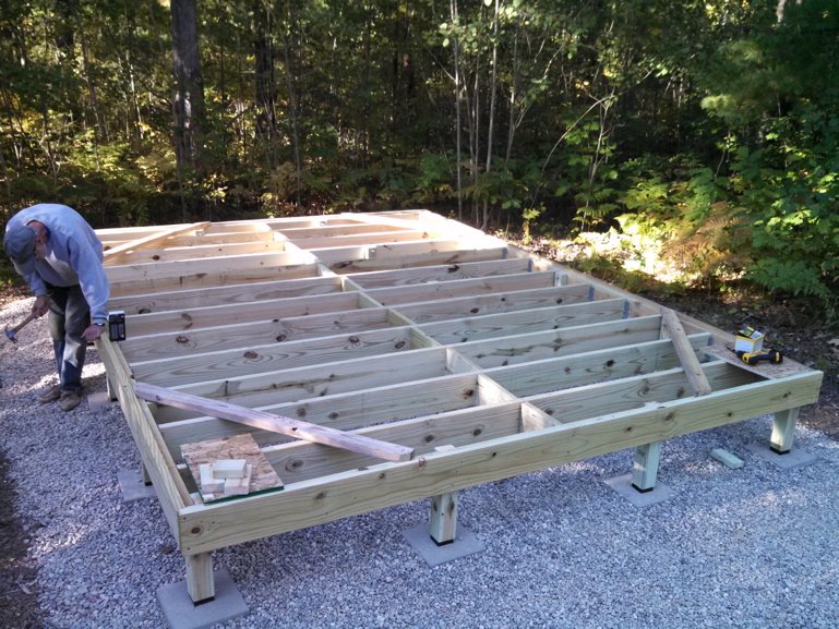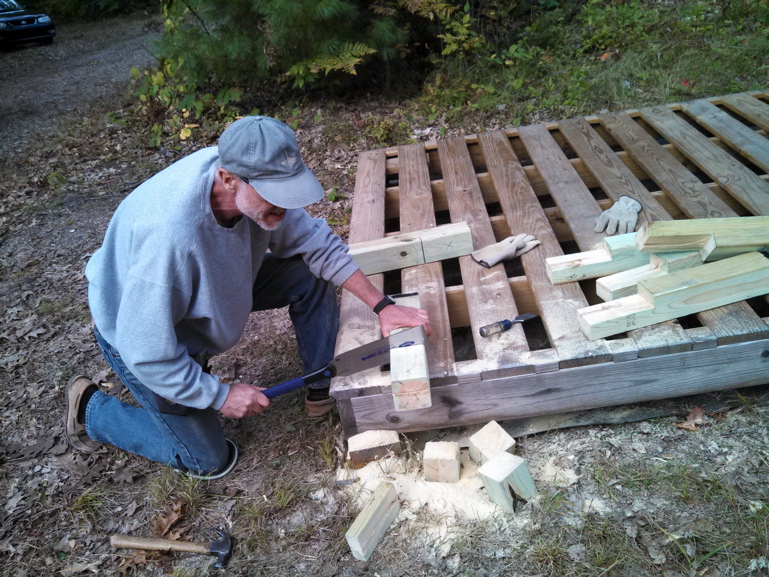 Step 2 : Laying out the frame then a LOT of ‘measure twice…. cut once’ for the 16 supporting legs and 11 floor joists! With the help of our daughter Andrea (an amazing woodworker in her own right!) we set to work….