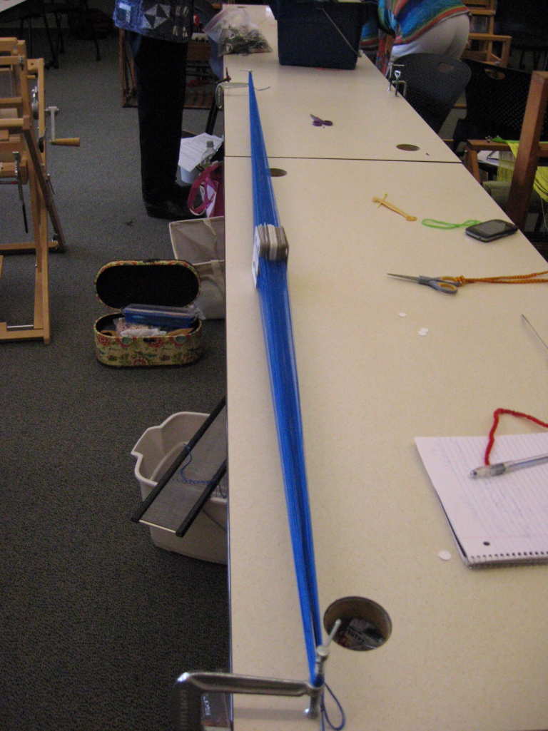 Next we wound our warp between 2 clamps – dropping 1 tablet with each pass until all 34 were in a pack on the table.