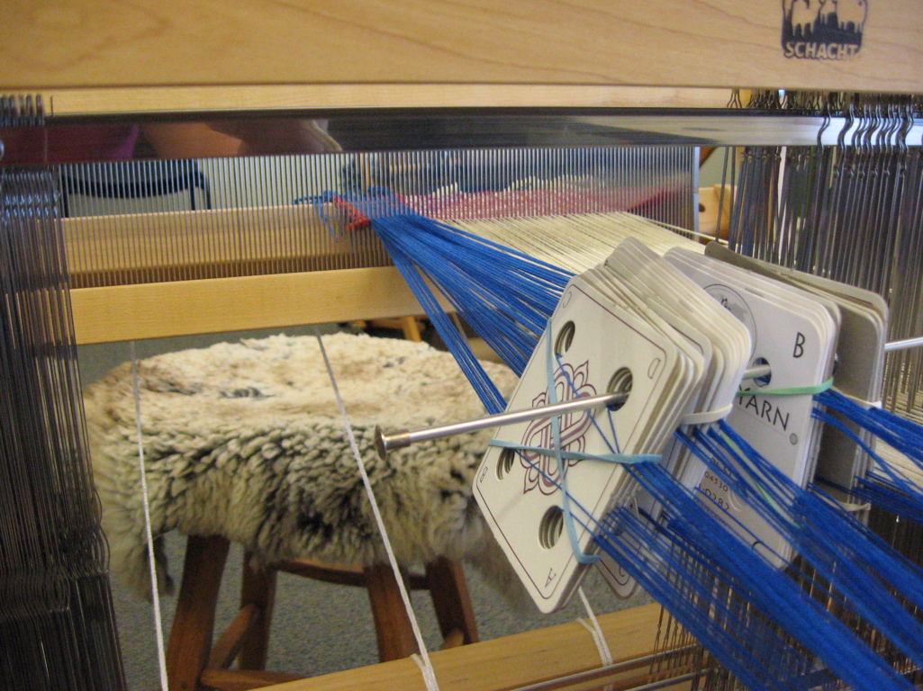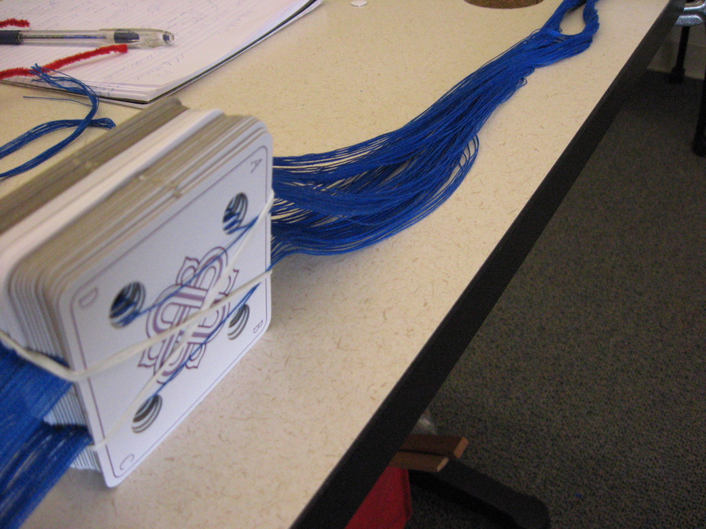 The warp yarns were then threaded into the reed in groups without shifting the order of the tablets or dropping any of them onto the floor!