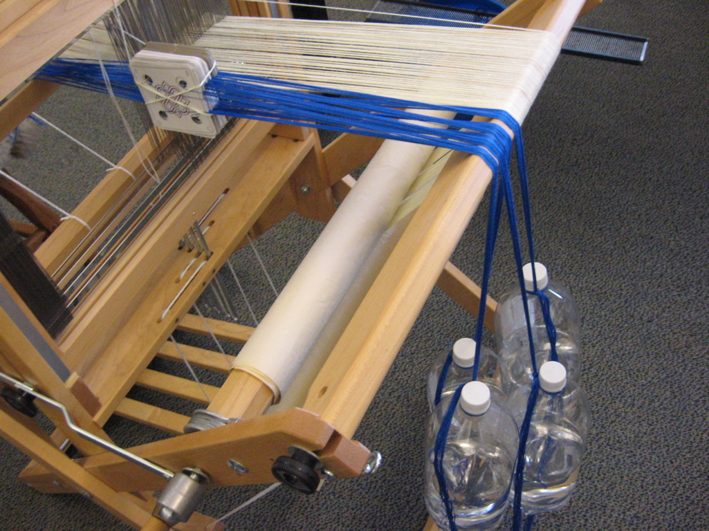The warp ends were tied securely to the front breast beam rod and water bottles were attached at the back to tension the warp.
