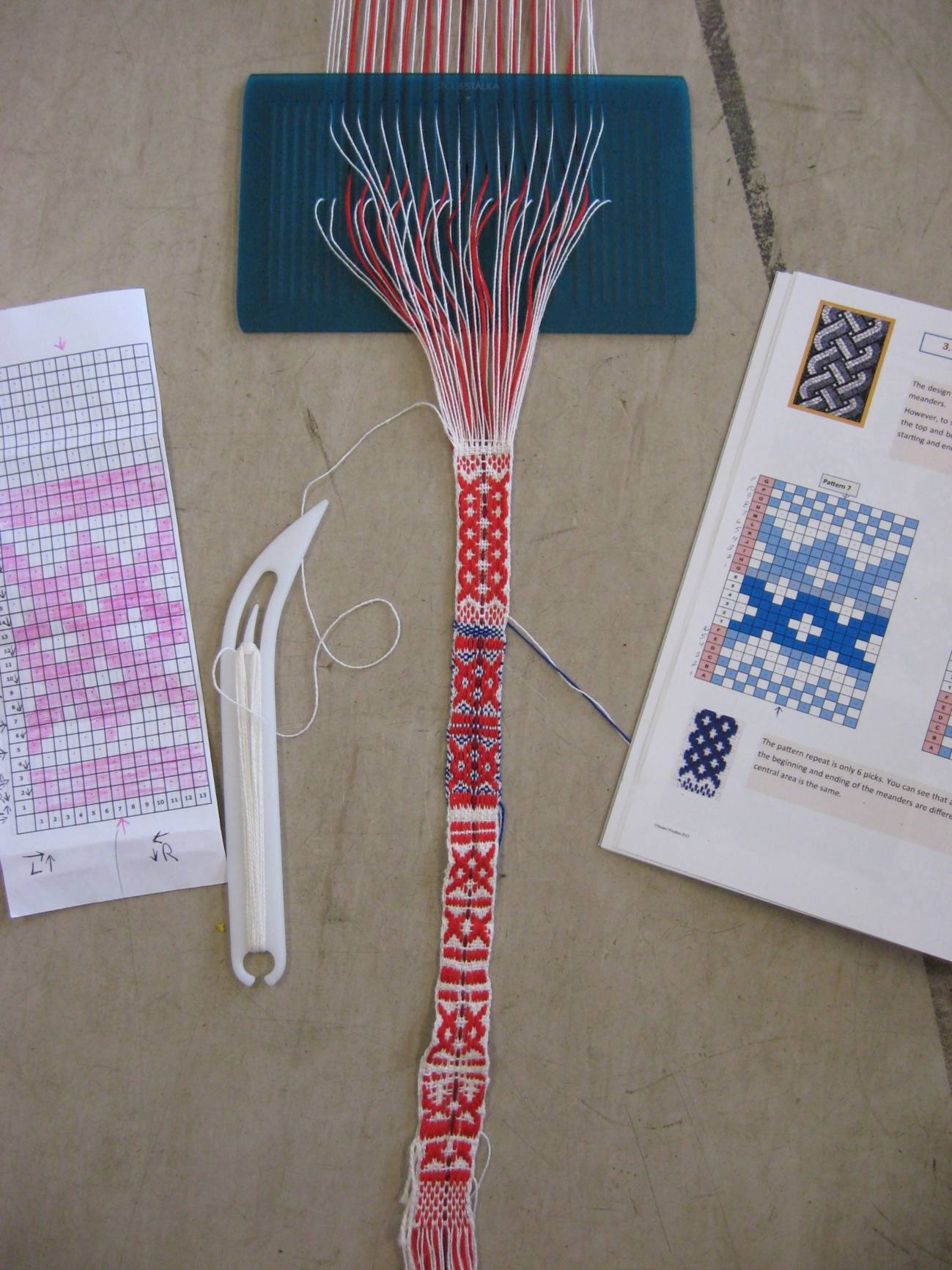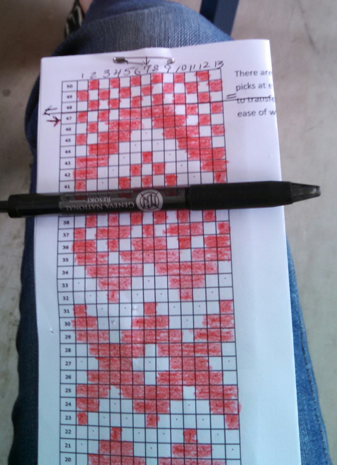 Tuesday we progressed to reading more complicated patterns.  I had to get a little creative to 1) keep the pattern in place and 2) know which step I was weaving as I wove a bookmark.