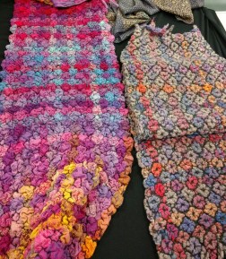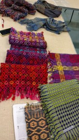 I was in luck – the London Guild of Weavers, Spinners and Dyers was meeting on Saturday and I got to tag along to the weaving interest group. The weavers have been studying deflective double weave and members brought in samples they made. Wonderful texture is achieved by weaving two layers simultaneous, a top and a bottom, and the warp and weft threads of each layer are interlaced.