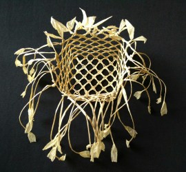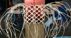 Coming home from the AGWSD Summer School [See my posts for August 2017] I had 3 baskets that I had not finished – the shifu paper lace basket, the miniature knotted/cord basket, and the dyed cane pouch.