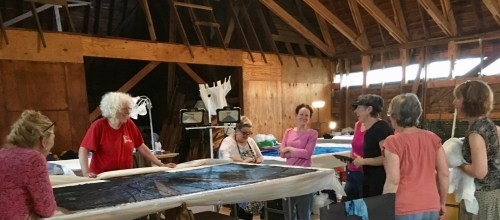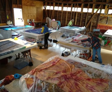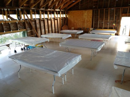With eleven people signed up and each of us needing table space of 8ft x 5ft/4.5m x 1.5m, AAFG member Helen Welford generously offered to host the workshop in the upper level ballroom of her barn.