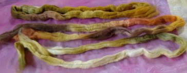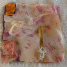 In the afternoon we made samples to check shrinkage rates and test color combinations. I had variegated wool roving that I thought might work well with my hand-dyed silk, plus black wool roving so a test was definitely in order.