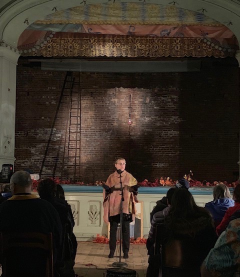 I have enjoyed wearing mine, especially when I performed the end of October at the Scary Story Festival in the haunted Howell Opera House. Built in 1881 the theater was closed in 1924 by the local fire marshal and has remained untouched for over 90 years. The space is unheated so on this cold rainy night my poncho was the perfect garment to wear as I told the frightening tale of a wandering musician who wears a pied cloak of rags.