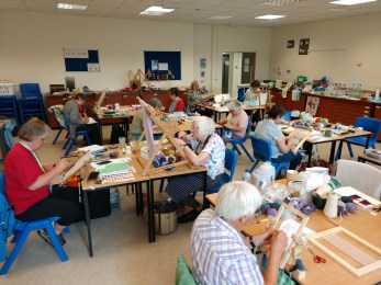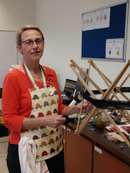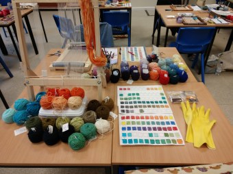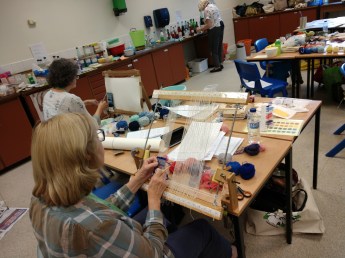 The afternoon is open to the public for a walk-about to see what all the classes have been doing so time to clean up my station. Not much weaving on the loom (I DID get it warped!) but lots of wonderful colors that I’ll be using for a future tapestry.