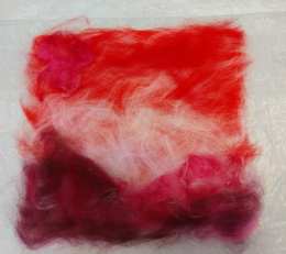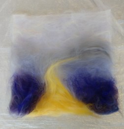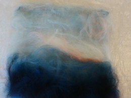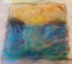 Make a horizon line and work each side with thin layers of similar colors. I’m using 12″ x 12″ silk chiffon as my base. It was fun to play and am pleased with how my piece came out. Everyone was amazed at the 40% shrinkage that happens when wet felting.