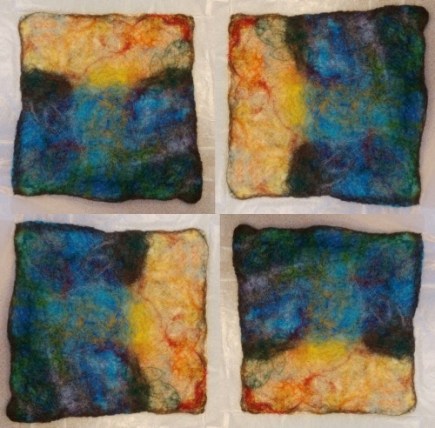 This sounded interesting. Abstract shapes could work very well for wet felting and I won’t have to draw a picture. I signed up for the class and let the instructor know that I will be wet felting with wool fibers. The instructor replied that she knows nothing about felting but is willing to let me have a go. I am the only fiber artist in the class; everyone else is working with acrylic or water color paints. All have been interested to see how the process of felting works and I’ve been fascinated to see what the others are doing.