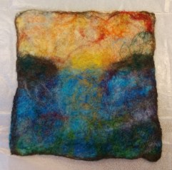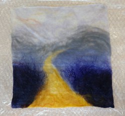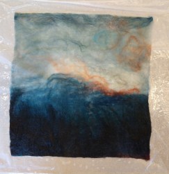 It was interesting to see how the piece changed in appearance yet again once it was fully felted. I still get a sense of foreground and distance but have lost some of the drama that was there when it was fist wetted down.