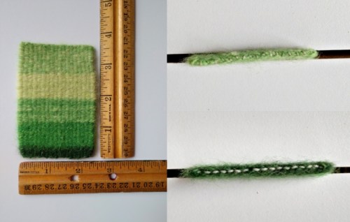 For my second try I used 20/6 seine twine for the warp set at 12 epi and played with a more varied color palette of finer wool. This was much harder to weave and the top selvedge is rather rough!