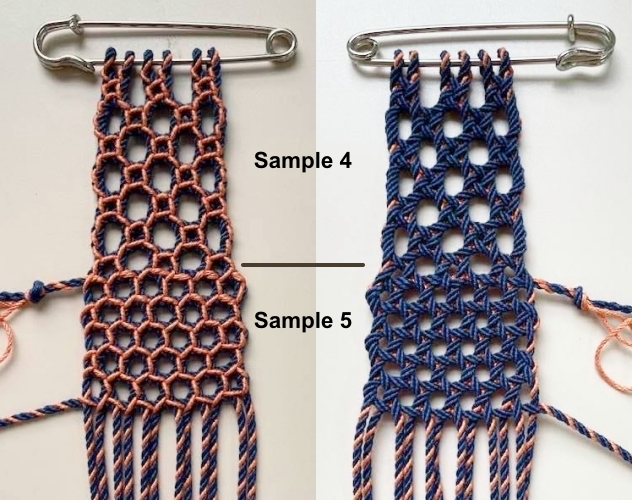 Again, I did OK with Sample #4 but Sample #5 was more complex using a darner to create hexagon openings. Wrapping my brain around this technique was NOT a smooth process! I put in rows…then took them out….did rows again….then took them out. By the end of the afternoon I at least was able to see when I had not done things correctly but I did not have solid understanding as to where I was going wrong. Time to take a break!