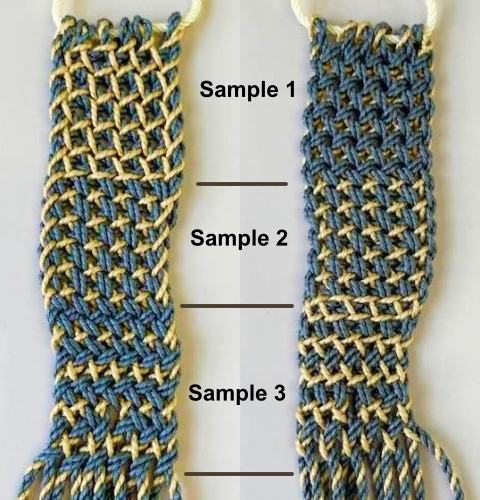 Julie Hedges, our instructor, gave us a series of samples to work on. Working with a 3 ply cotton cord with 2 plies in one color and 1 ply in a contrasting color made it easier to become familiar with the tool, a gripfid, and the technique of Plain Oblique Twining (POT). One of interesting aspects is the front and back show different colors creating a double cloth. I did OK plugging along in the morning session with the first 3 samples. Learning how to read the patterns would take time but I was getting the hang of the concept.