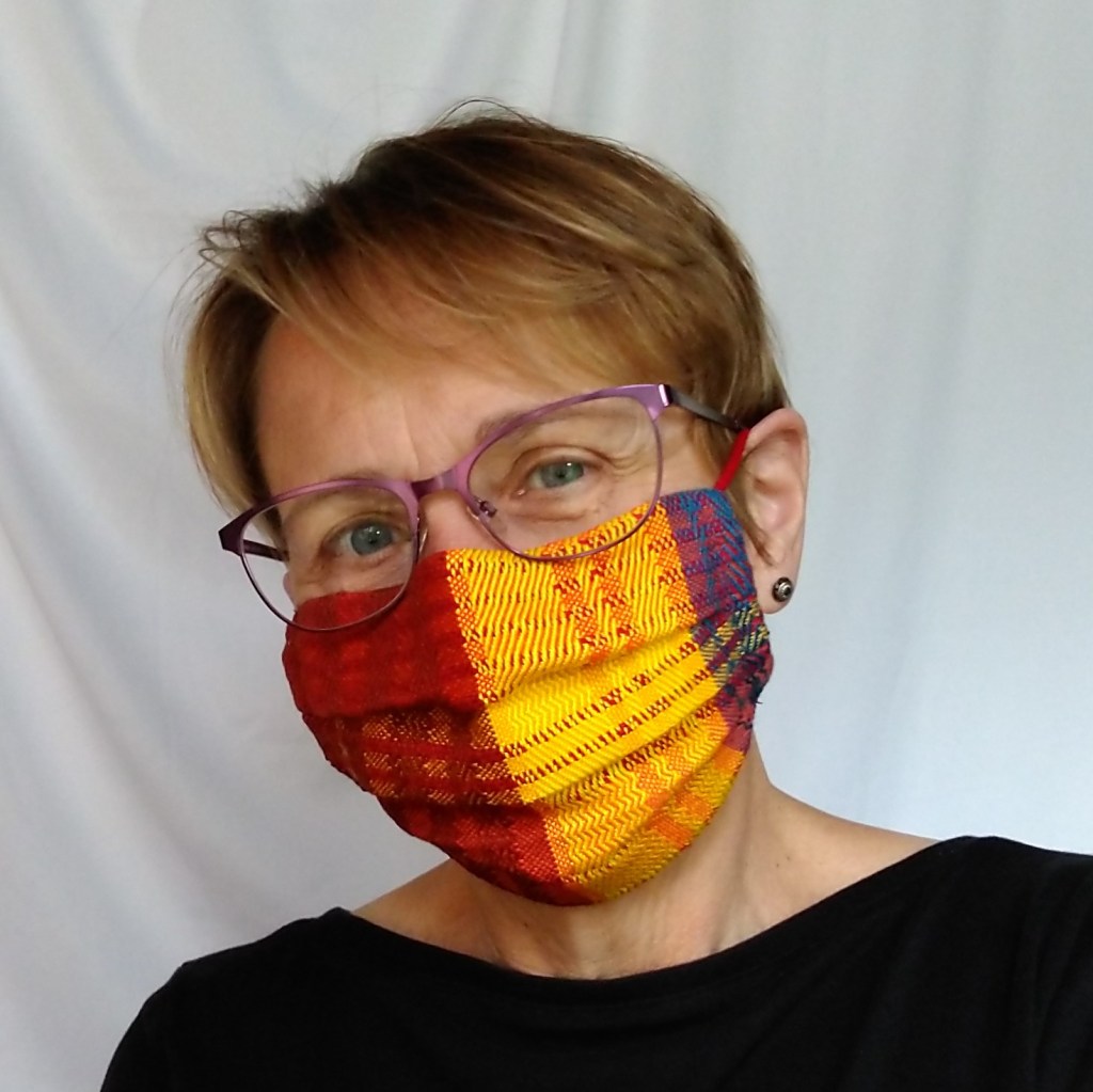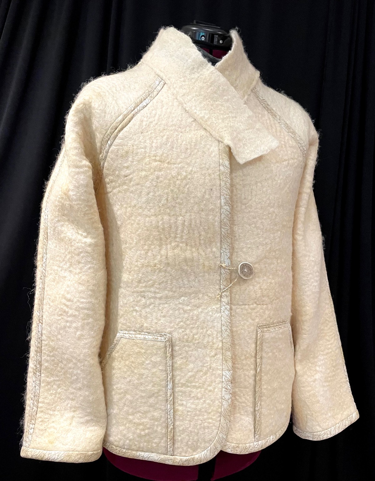 The evening program was the fashion show. It is always great to see what everyone has been working on, especially the ‘Covid Lockdown’ projects. I brought my “Two Sides to Every Story: A Functional Covid Art Mask” and my newly completed just-in-time-to-bring-with-me “Back-to-Back Jacket – 4 Years in the Making from a Romney Fleece”. (I’ll be writing about the making of the felt jacket in an upcoming blogpost once I have lining completed.)
