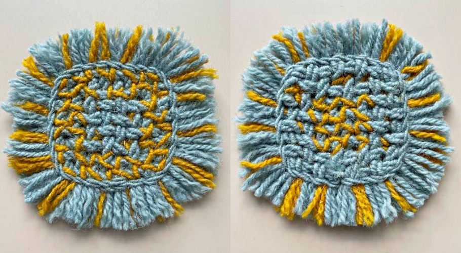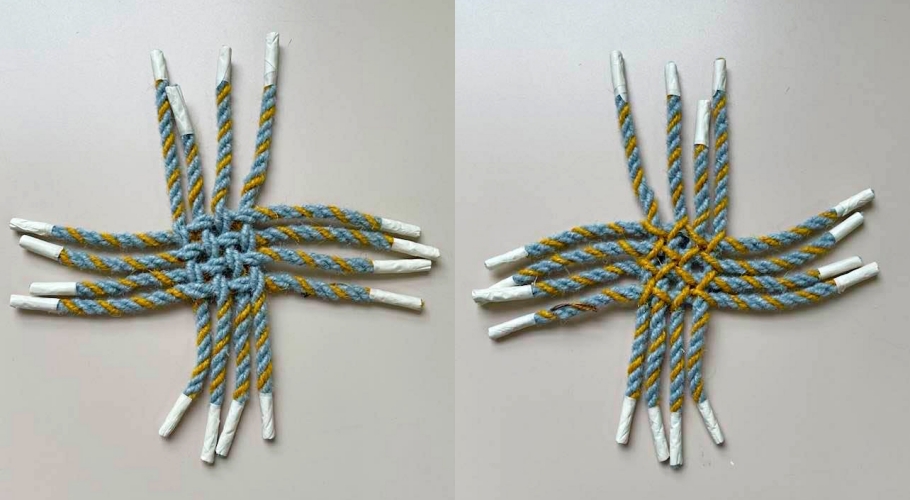 At the midweek point and a 1/2 day for instruction, we started winding our own cords for the next project – a larger circle using the hexagon pattern. I used rug weight wool for this next project.