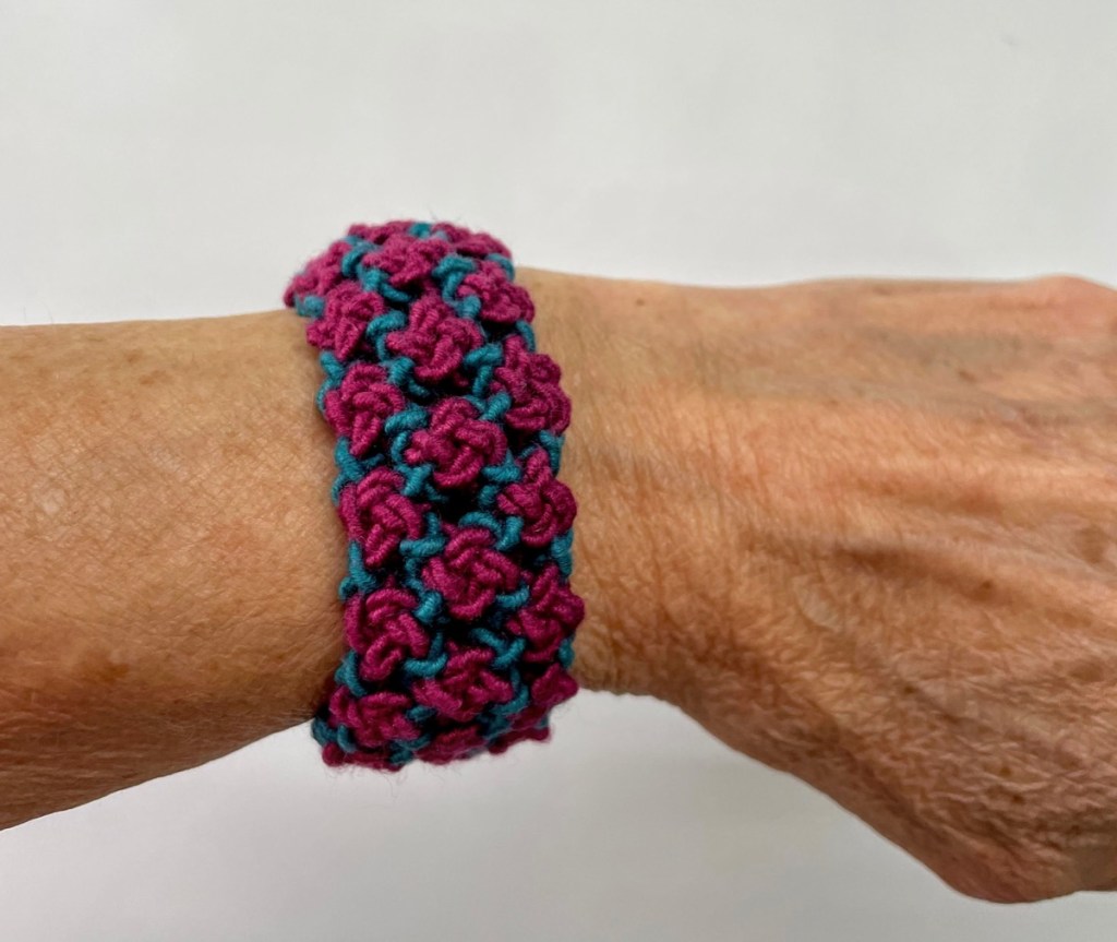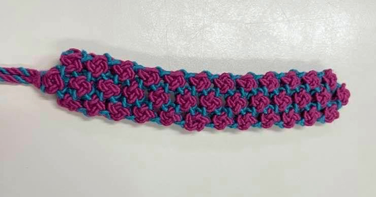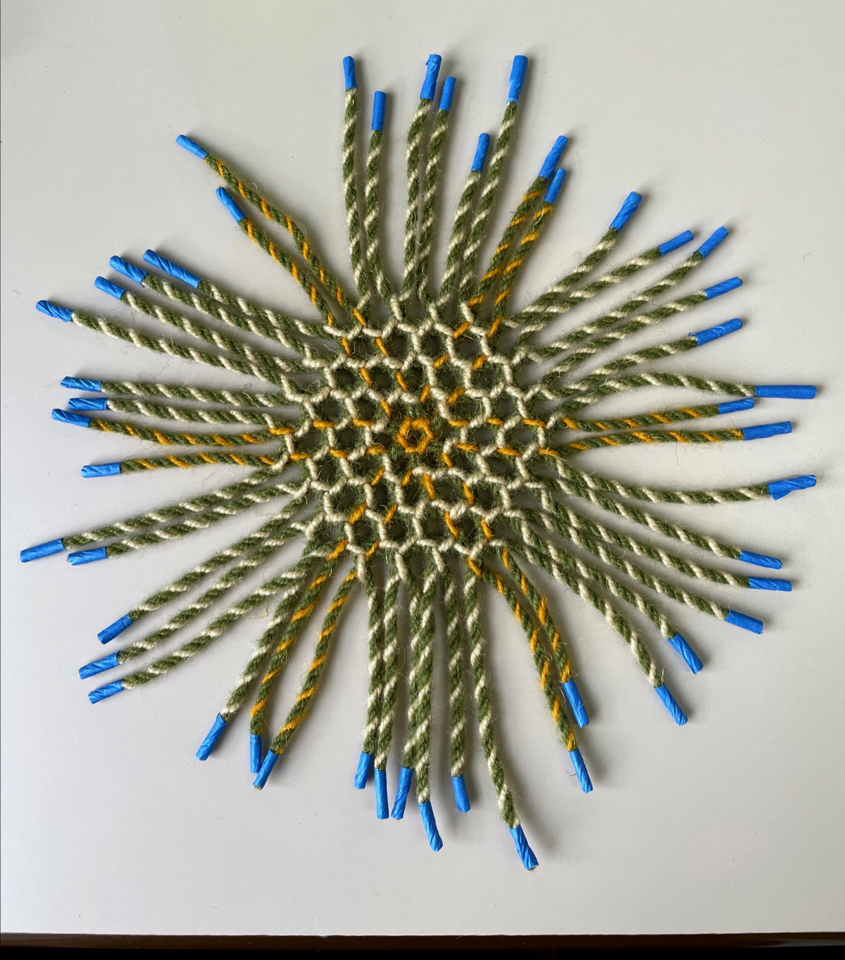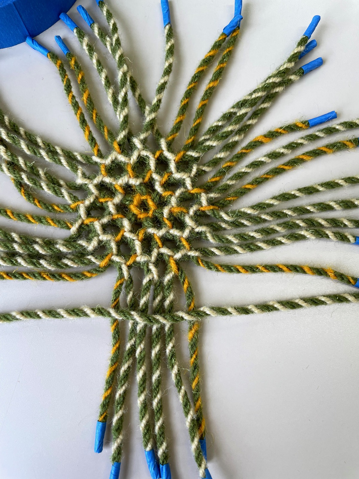 With fresh eyes I continued working on the new hexagon project. As was true earlier in the week, this was not smooth sailing and definitely gave my braincells a workout! I spent a LOT of time putting in rows… then taking them out as I could not yet get the sequence right. The hard part is keeping track of each of the 6 sides when adding a cord to each after a 4 row sequence. Even Julie struggled a bit trying to decipher where I would go wrong. After much muttering and gnashing of teeth, I decided to undo everything and go back to the starting row.