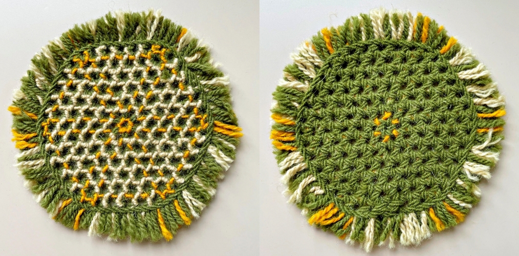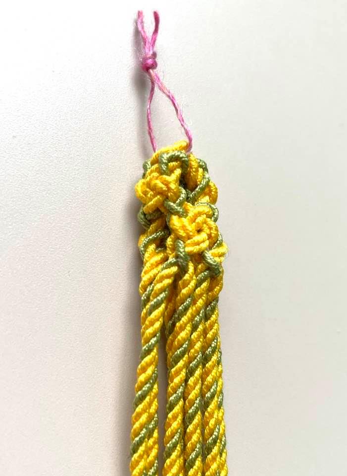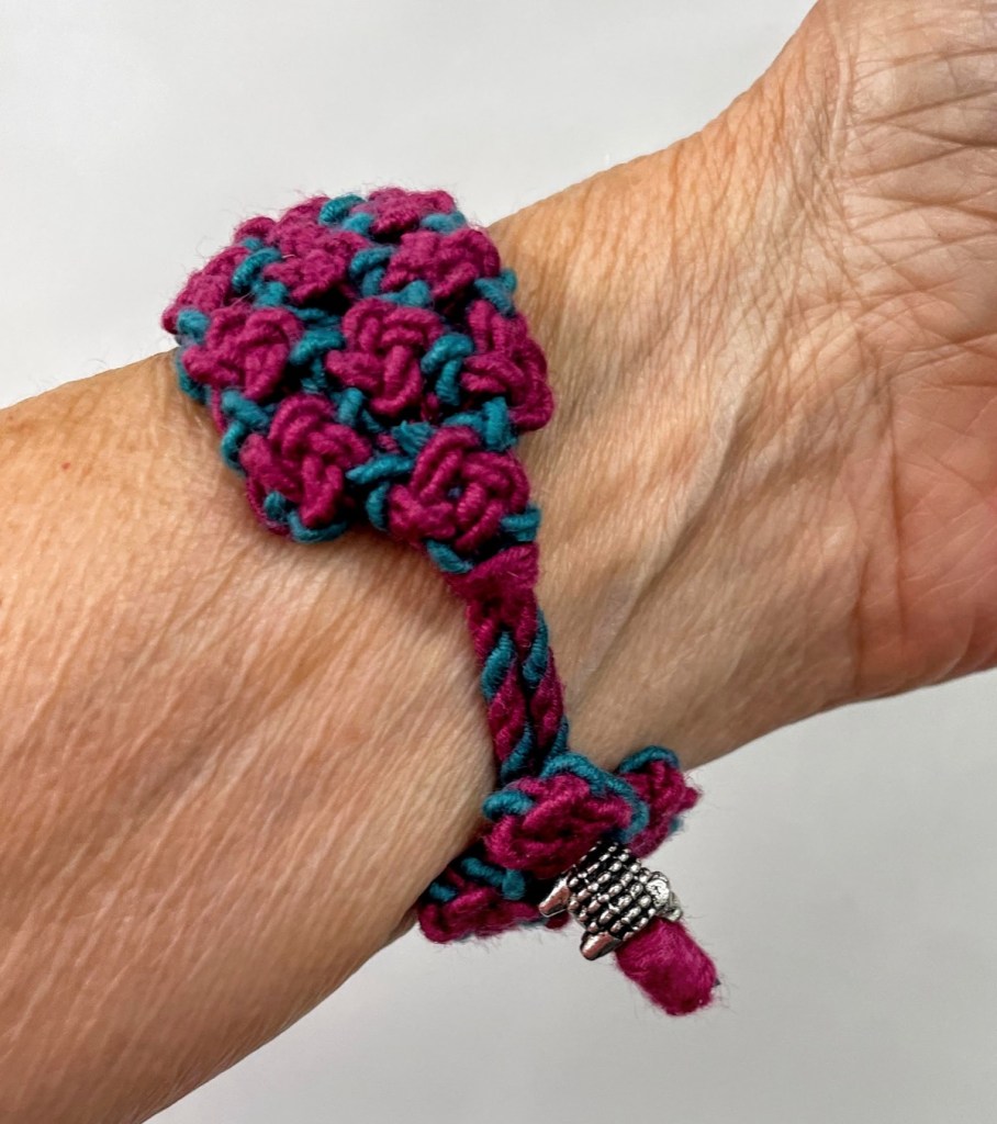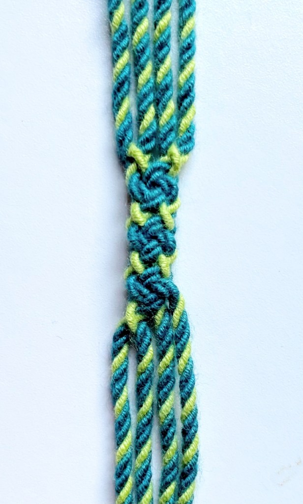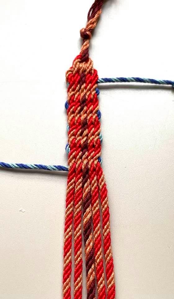 With fresh eyes I continued working on the new hexagon project. As was true earlier in the week, this was not smooth sailing and definitely gave my braincells a workout! I spent a LOT of time putting in rows… then taking them out as I could not yet get the sequence right. The hard part is keeping track of each of the 6 sides when adding a cord to each after a 4 row sequence. Even Julie struggled a bit trying to decipher where I would go wrong. After much muttering and gnashing of teeth, I decided to undo everything and go back to the starting row.