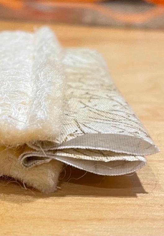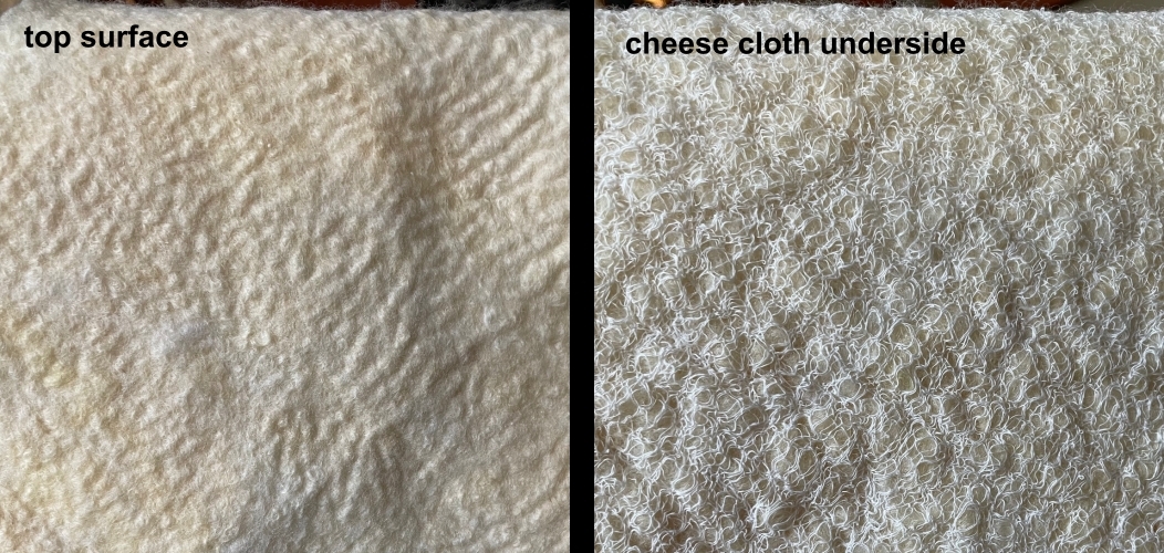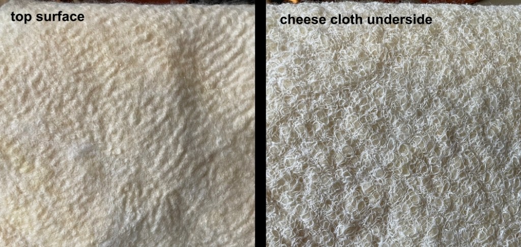 I knew my resulting felt could be uneven and have thin spots because I use wool roving now and it’s been ages since I worked with wool batts. I used cotton cheese cloth to give the felt fabric an added layer of structural support just in case.