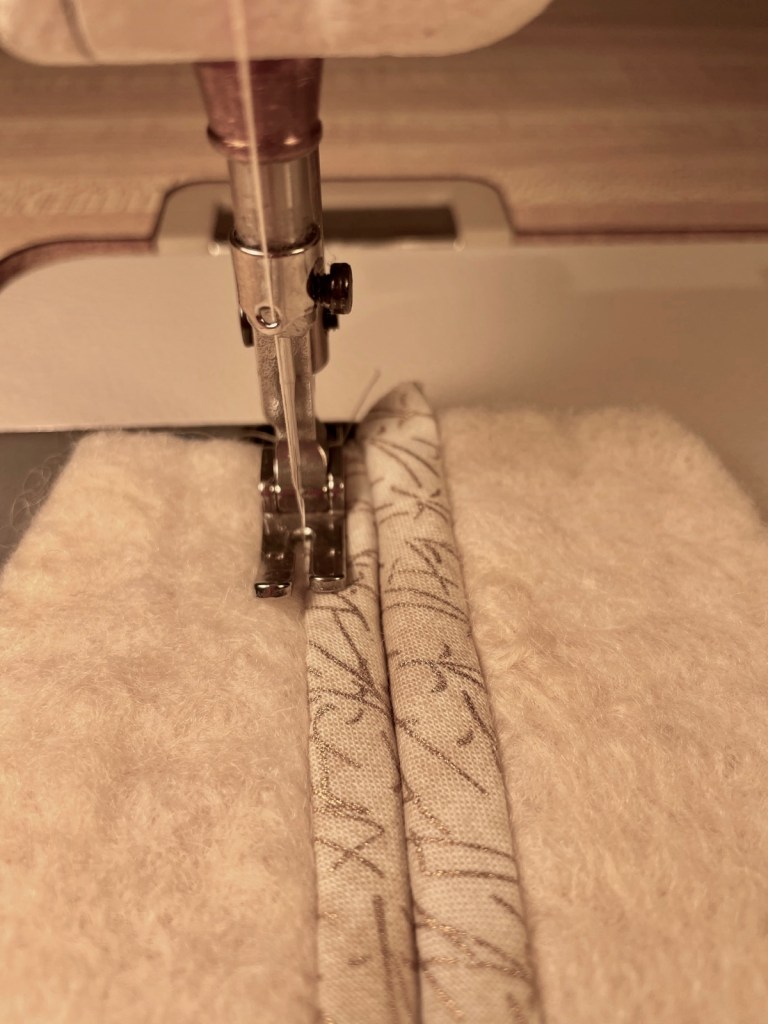 On the right side of the felt fabric ‘stitch-in-the-ditch’ securing the bias tape to the wrong side of the felt.