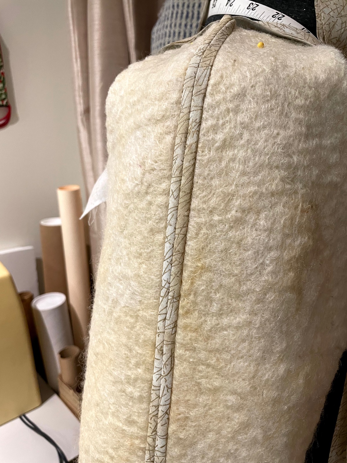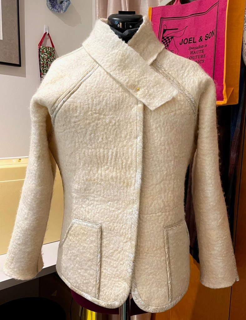 I first learned of this tailoring technique back in 2008 when Daryl Lancaster presented a workshop on garment construction using handwoven fabric for the Ann Arbor Fiberarts Guild and it has become my ‘go-to’ seam binding when dealing with thick felt.