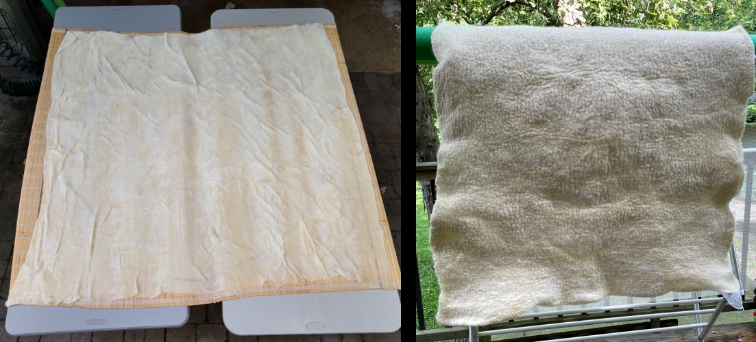 Using the rest of the wool I made another panel BUT this second piece of felt came out 1/4″ (.6 cm) thick. I now have one piece that is heavy coat weight and one that is rug weight!
