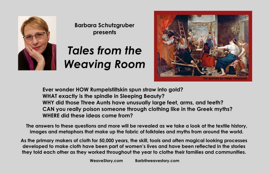It was a pleasure to share a timeline and brief history of textile technology spanning 50,000 years, and stories whose imagery is rooted in the making of cord and cloth with modern ‘fiber folk’ because we are part of a long history as we stand on the shoulders of those who went before us. We are the stuff of stories when we spin ‘straw into gold‘ (flax into linen) and carry ‘magic wands‘ (spindles and knitting needles).