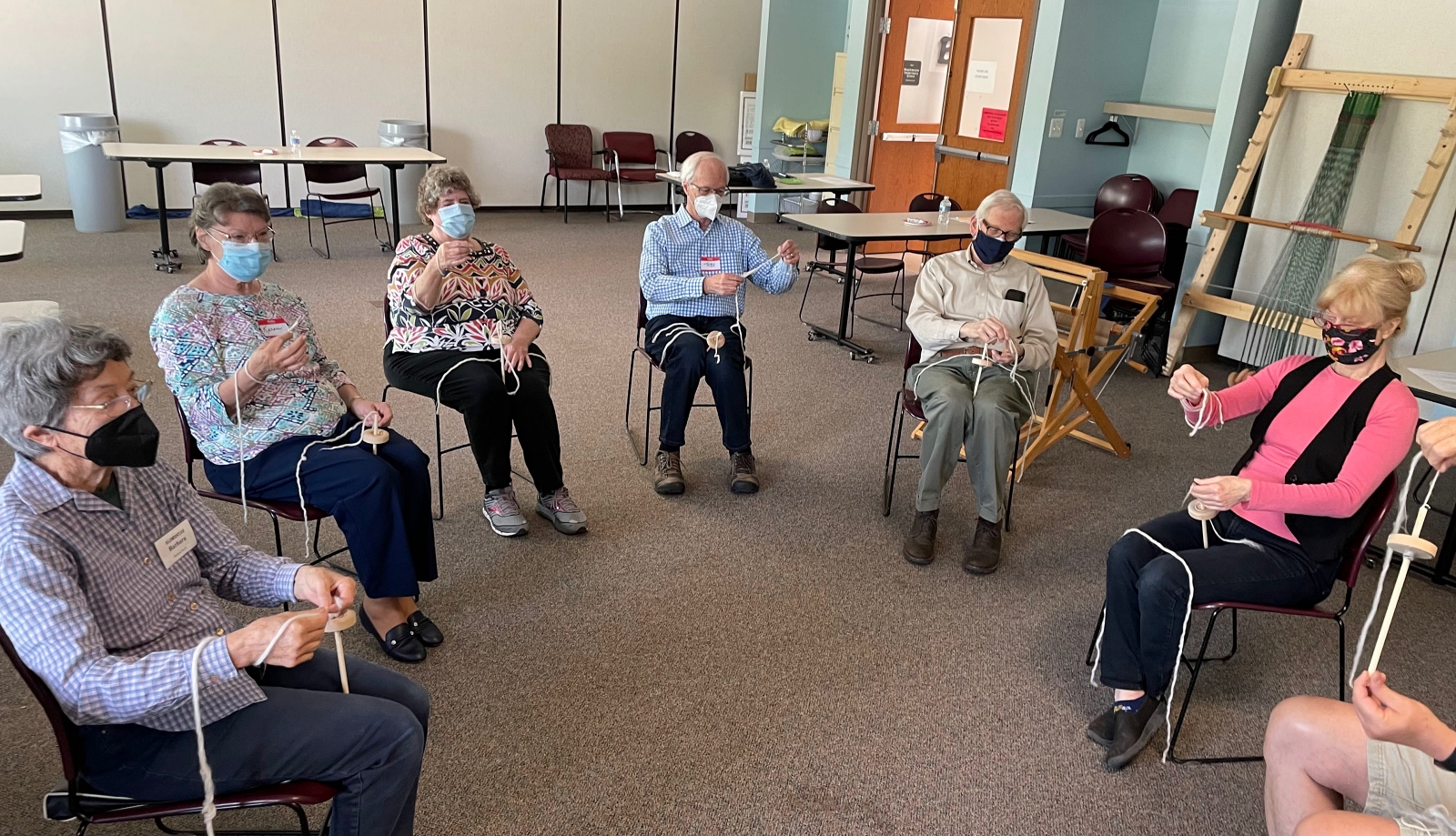 The full 2 hour presentation of ‘Tales from the Weaving Room’ was on May 12th for Elderwise Learning in Ann Arbor. After 2 years on Zoom they have started meeting once again in person with limited class sizes. Starting with the PowerPoint and moving on to the hands-on portion, everyone tried spinning wool using a drop spindle….