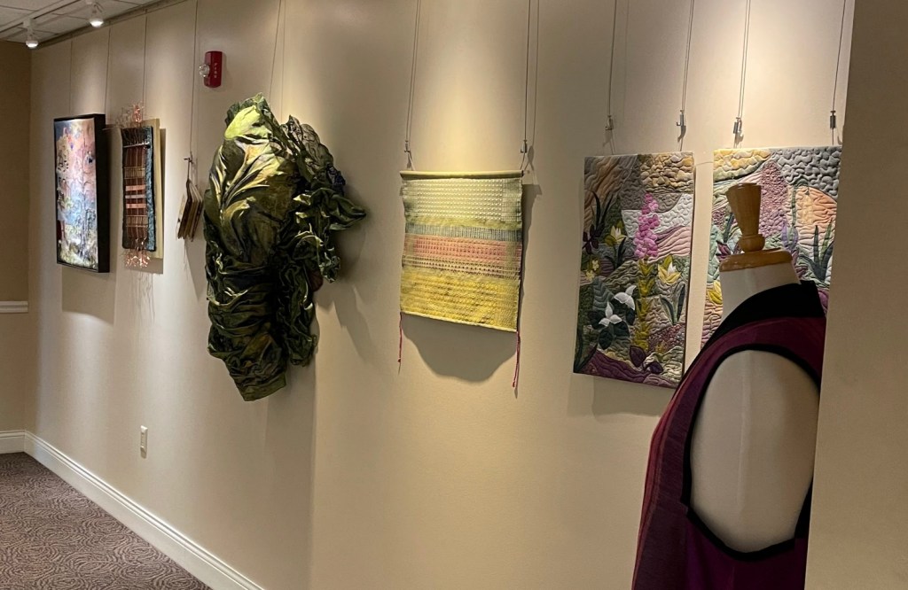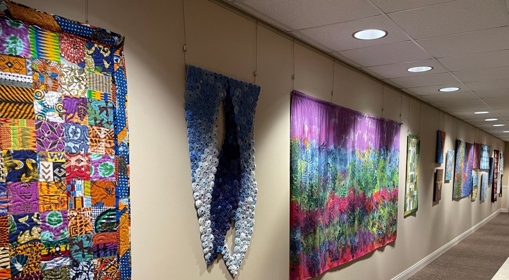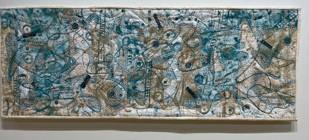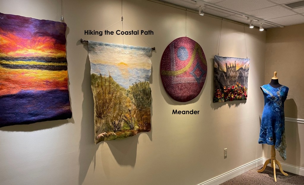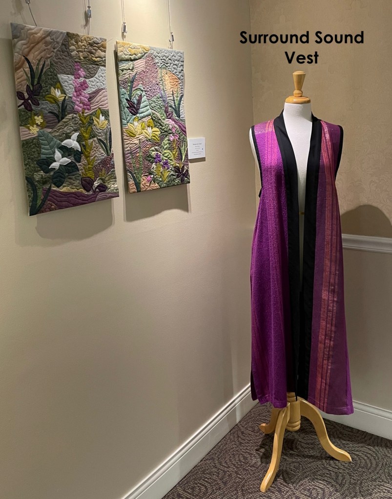The Ann Arbor Fiberarts Guild exhibit “The Many Faces of Fiber Art” runs from May 3-June 29, 2022 in the gallery space at Silver Maples Senior Living, Chelsea Michigan. The exhibit includes work from 17 guild members representing a wide range of techniques: weaving, surface design, tapestry, paper making, marbling, rug hooking, 3D sculptural, stitch work and embroidery. I have 3 pieces in the show – Hiking the Coastal Path, Meander, and Surround Sound Vest.
