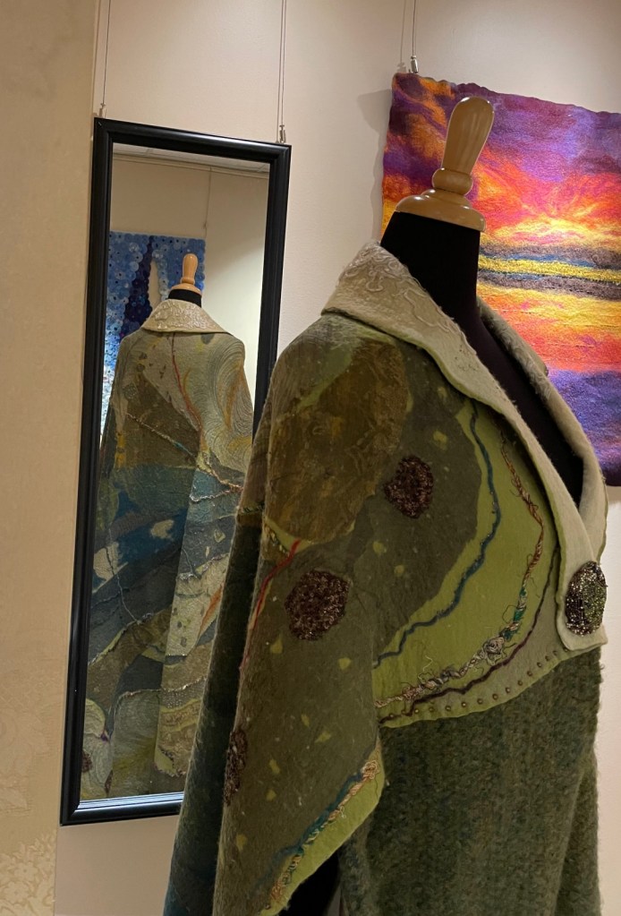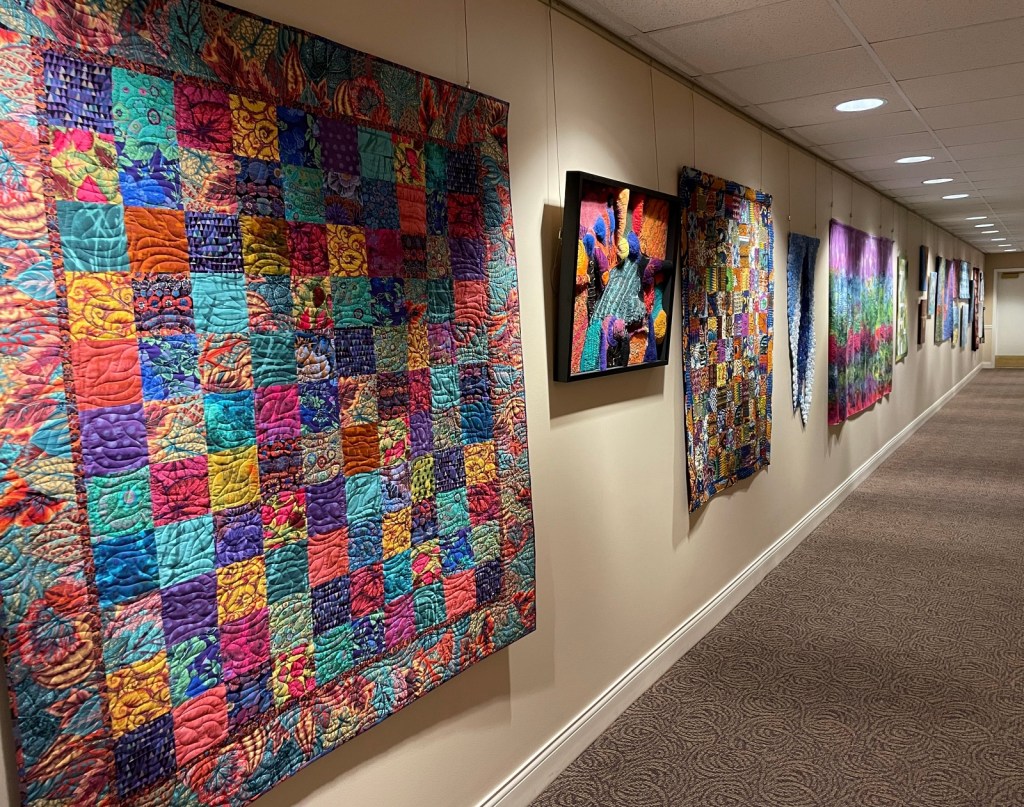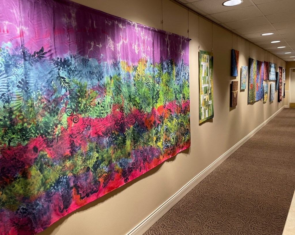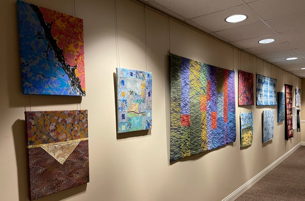 The Ann Arbor Fiberarts Guild exhibit “The Many Faces of Fiber Art” runs from May 3-June 29, 2022 in the gallery space at Silver Maples Senior Living, Chelsea Michigan. The exhibit includes work from 17 guild members representing a wide range of techniques: weaving, surface design, tapestry, paper making, marbling, rug hooking, 3D sculptural, stitch work and embroidery. I have 3 pieces in the show – Hiking the Coastal Path, Meander, and Surround Sound Vest.