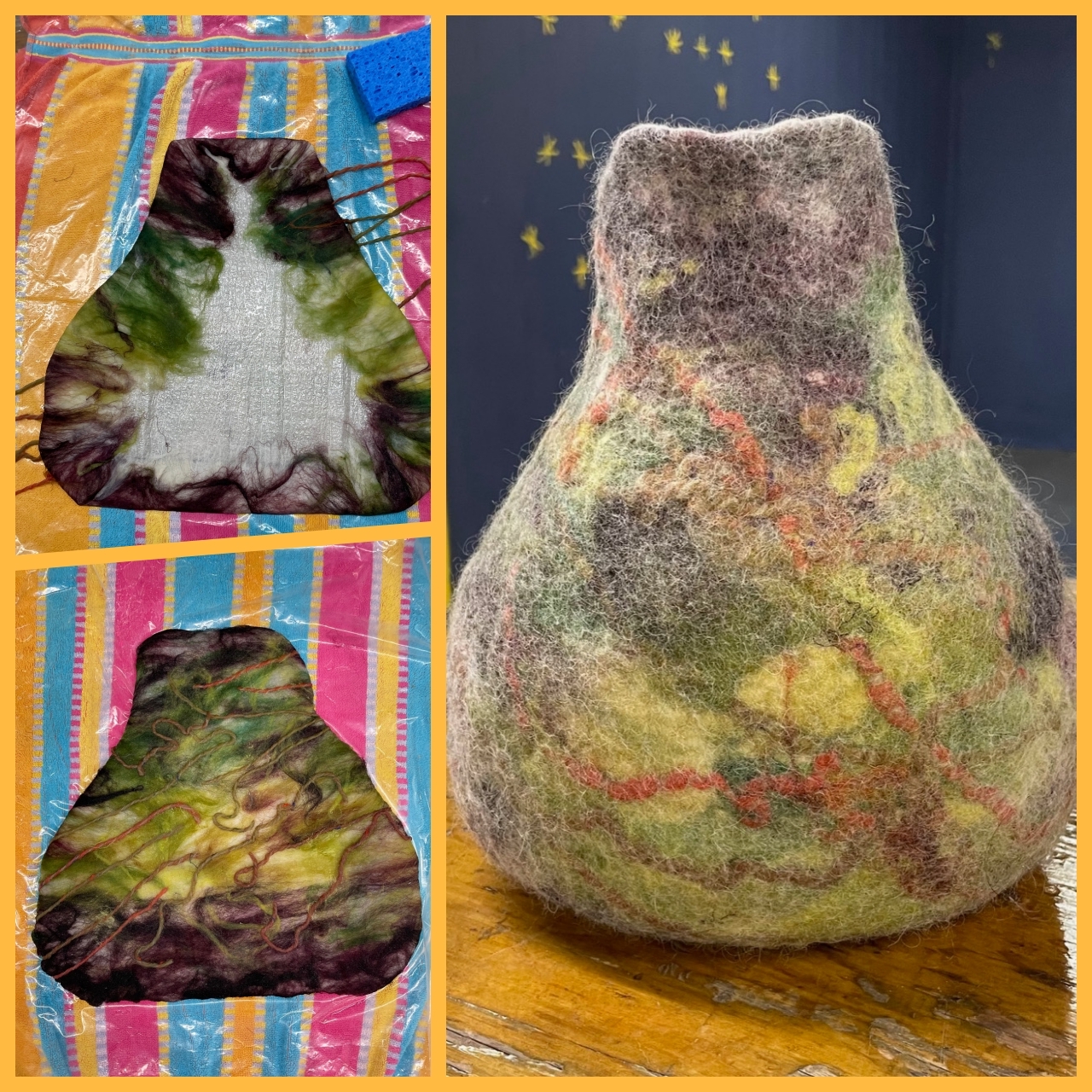 I’ve been felting for at least 25 years but have not done much in the way of making larger vessels. The smaller vessels I’ve done were made using the Merino wool so the vessel is softer and not as stiff. In this workshop we used Finn wool which is a heavier fiber and makes a much firmer felt than the Merino wool which is excellent for larger vessels.