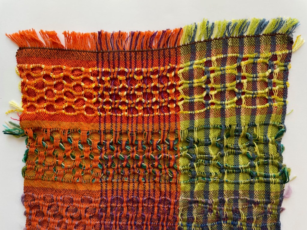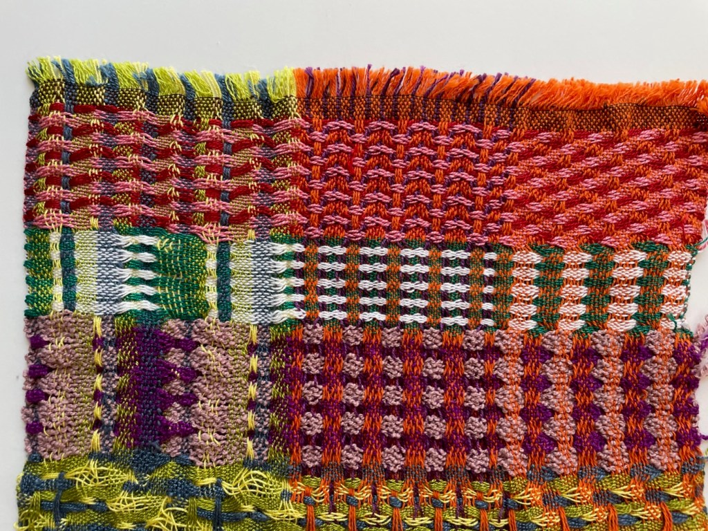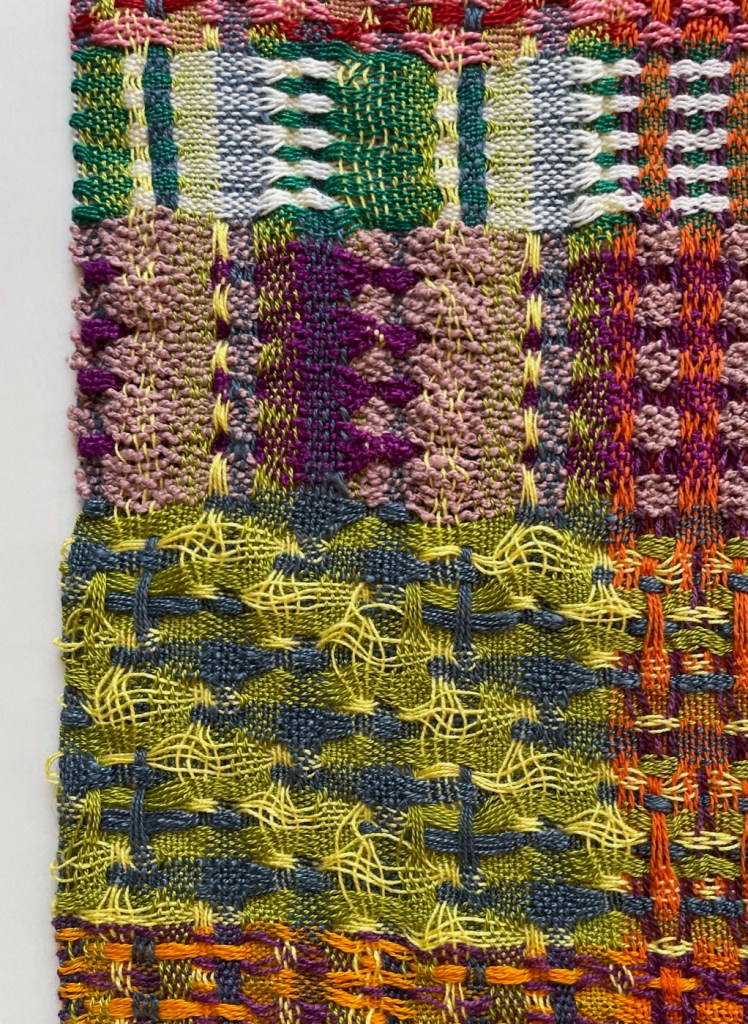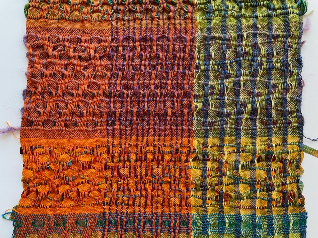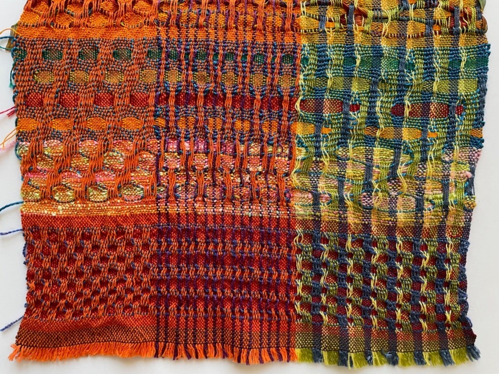 Honeycomb was the most playful and dramatic! For each treadling sequence I used different thick outlining yarns including loosely spun silk fibers, ribbon, wool roving, and 6 very thin yarns grouped together and I varied the size of the cells. I’m not sure how I will use Honeycomb fabric in future projects but I really want to play with this some more!