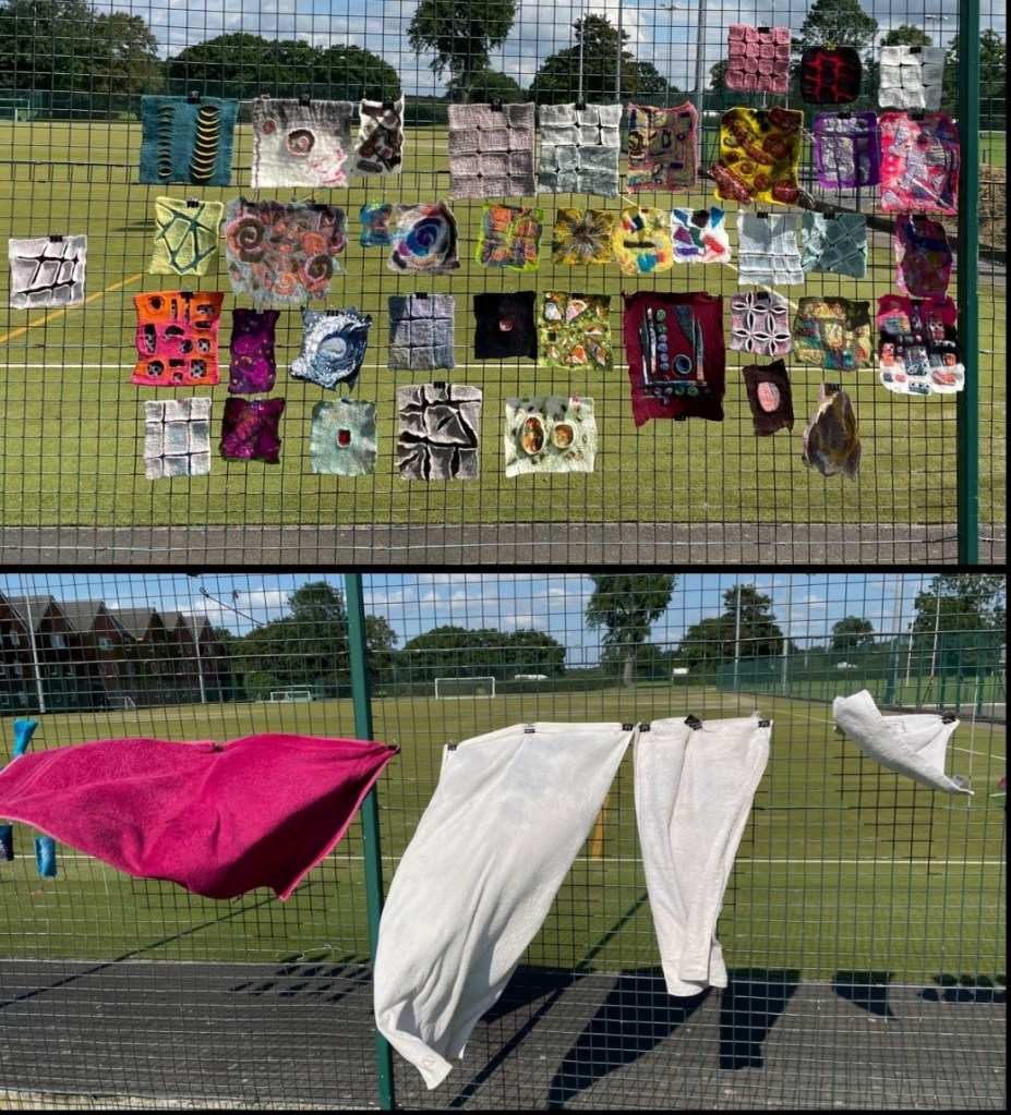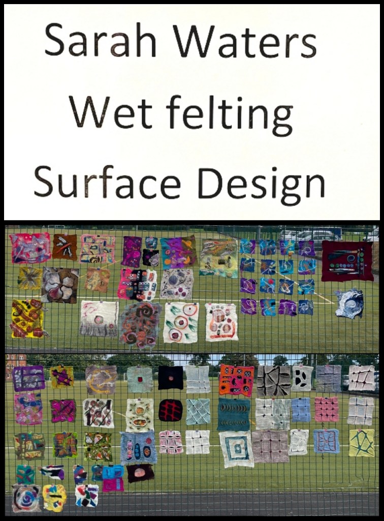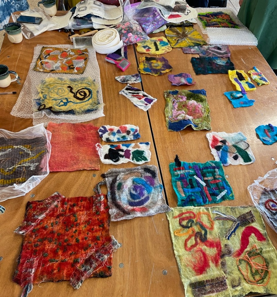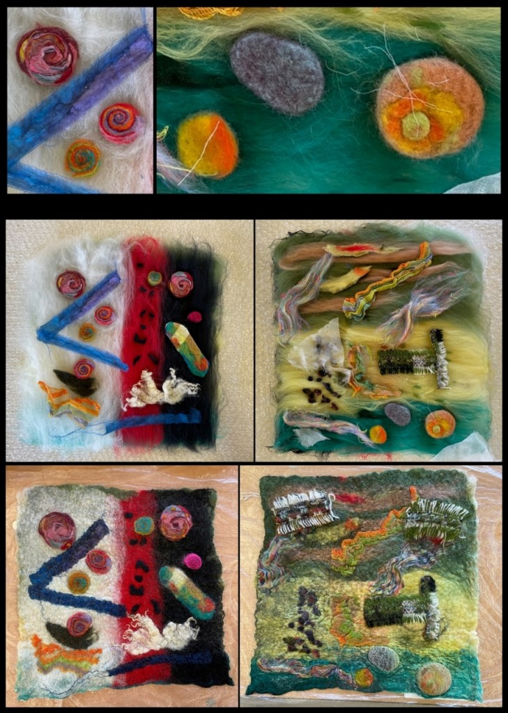 Day 6 – Time to try some of the many techniques Sarah showed us. I made 2 more pieces layering prefelts and silk fabric as well as making 3D bubbles.