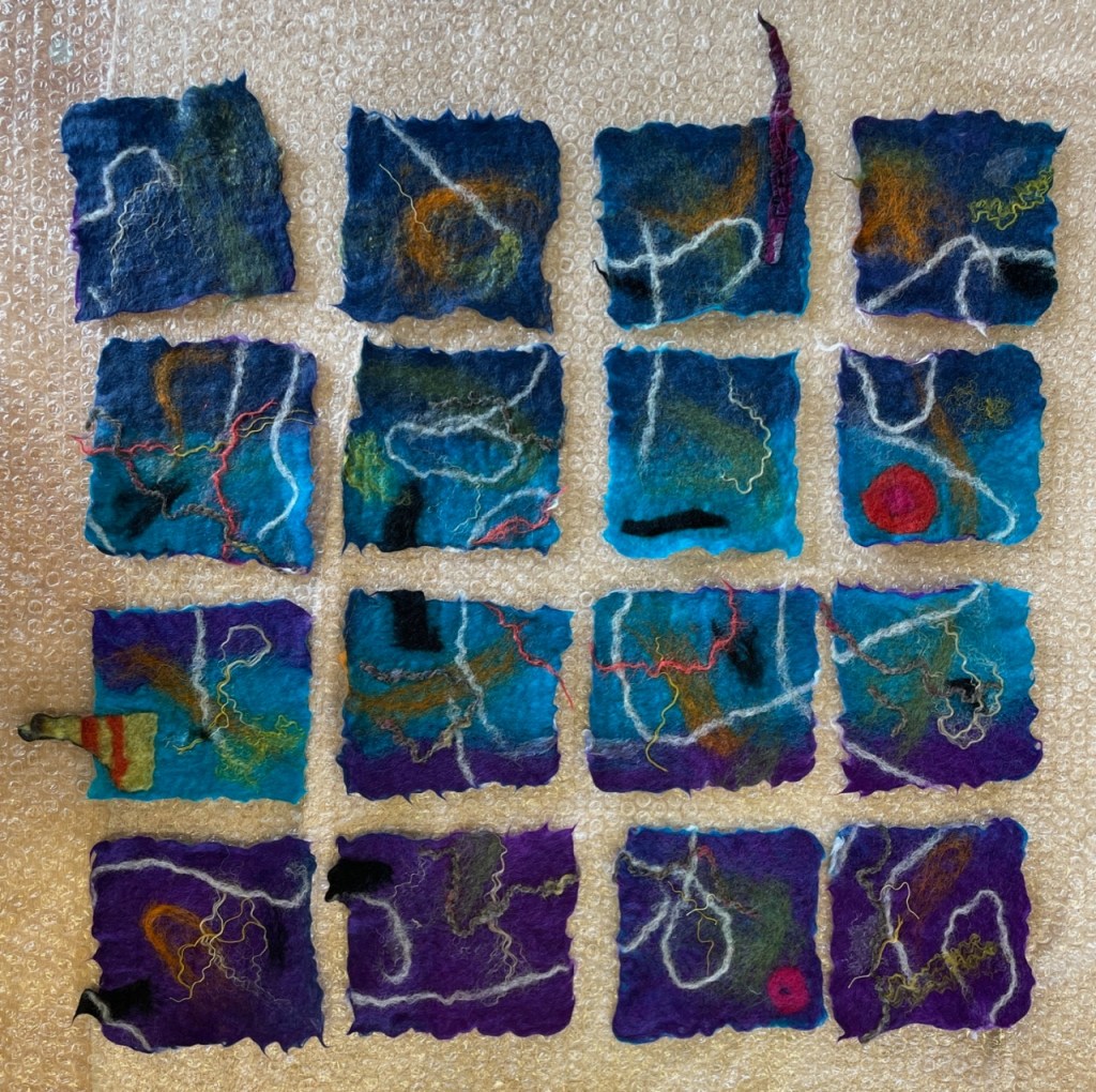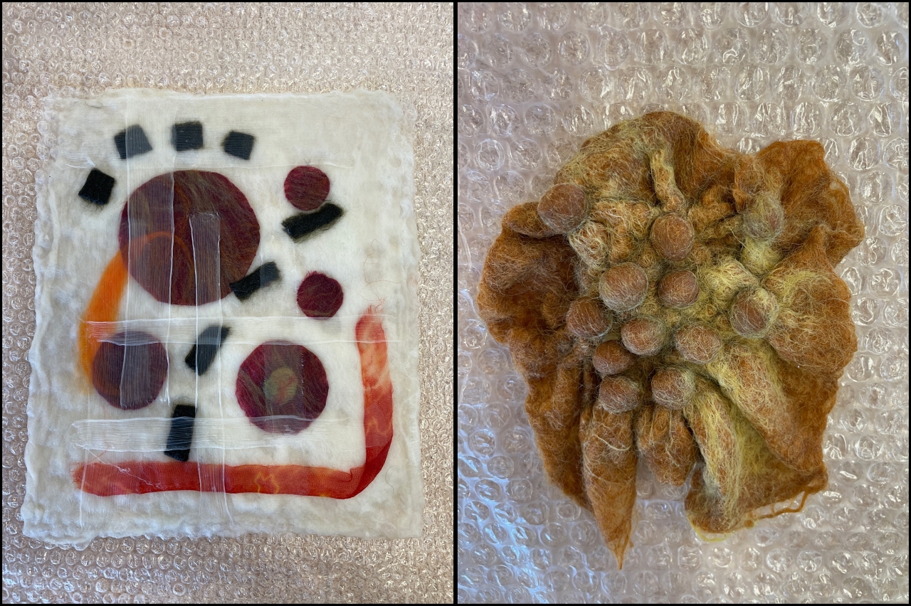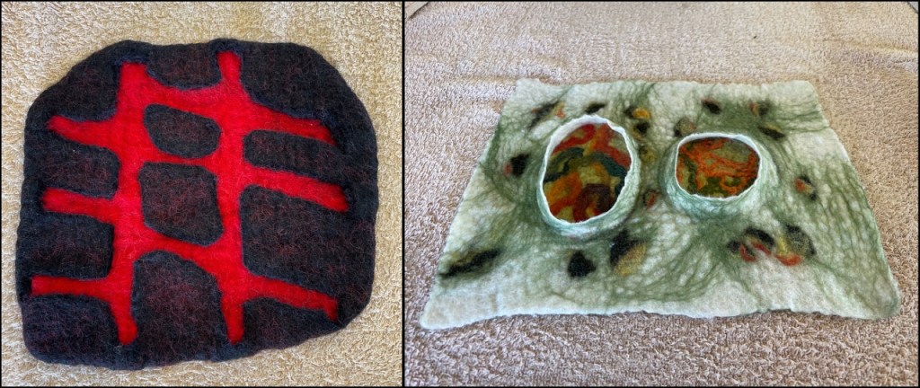 We spent the day making pre-felts (partially felted), cutting them up, then using the pieces to make something new.