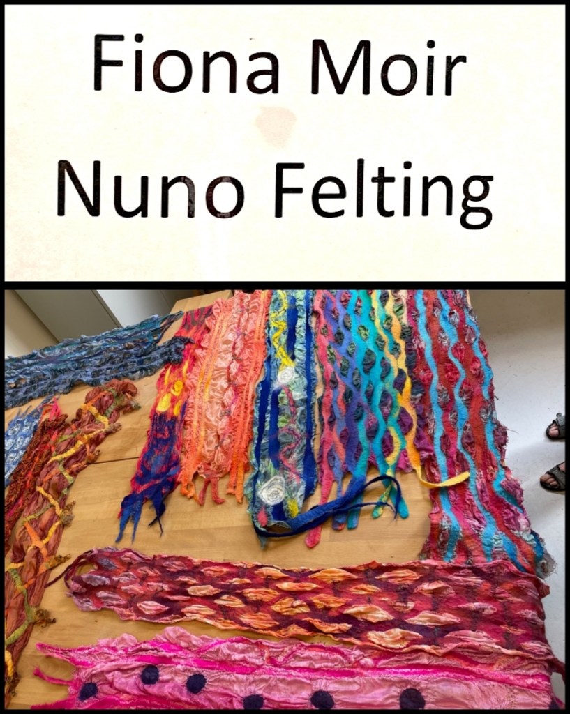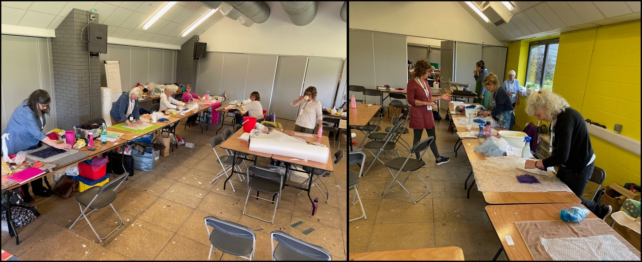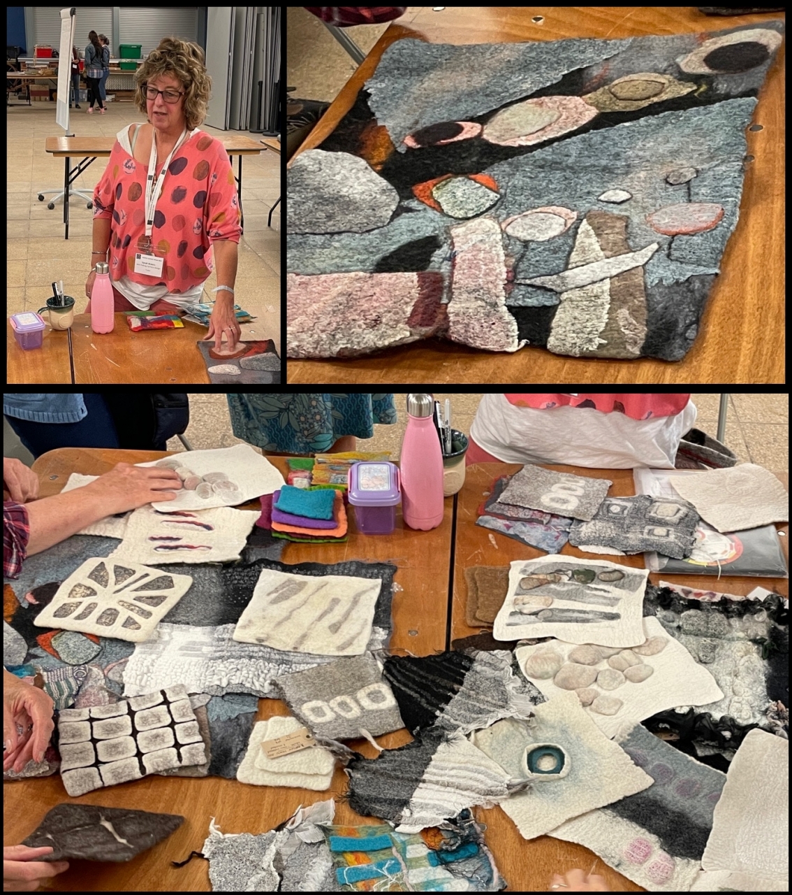 This year 17 courses were offered with 280 participants attending. After gathering for general information and announcements we all headed off to our course workrooms. My course was Wet Felting and Surface Design with Sarah Waters. Sarah outlined the activities for the week ahead and had plenty of examples for us to look at and touch.