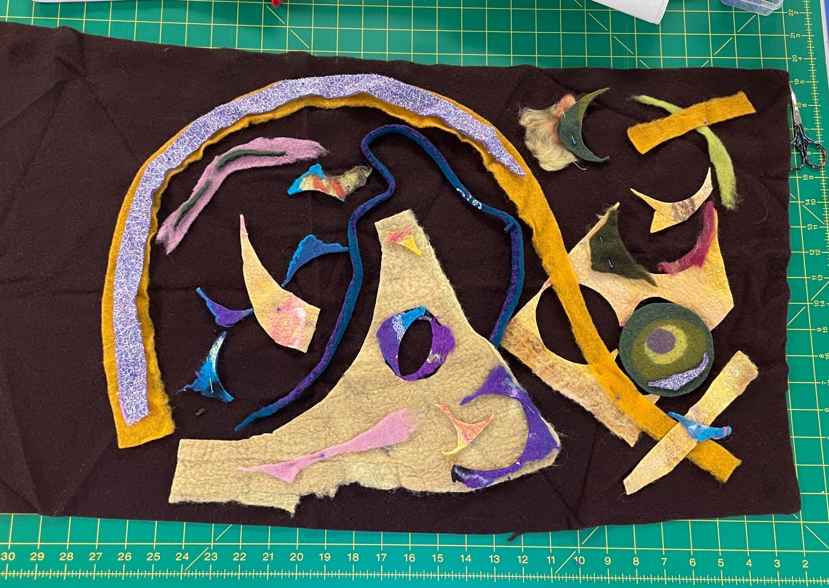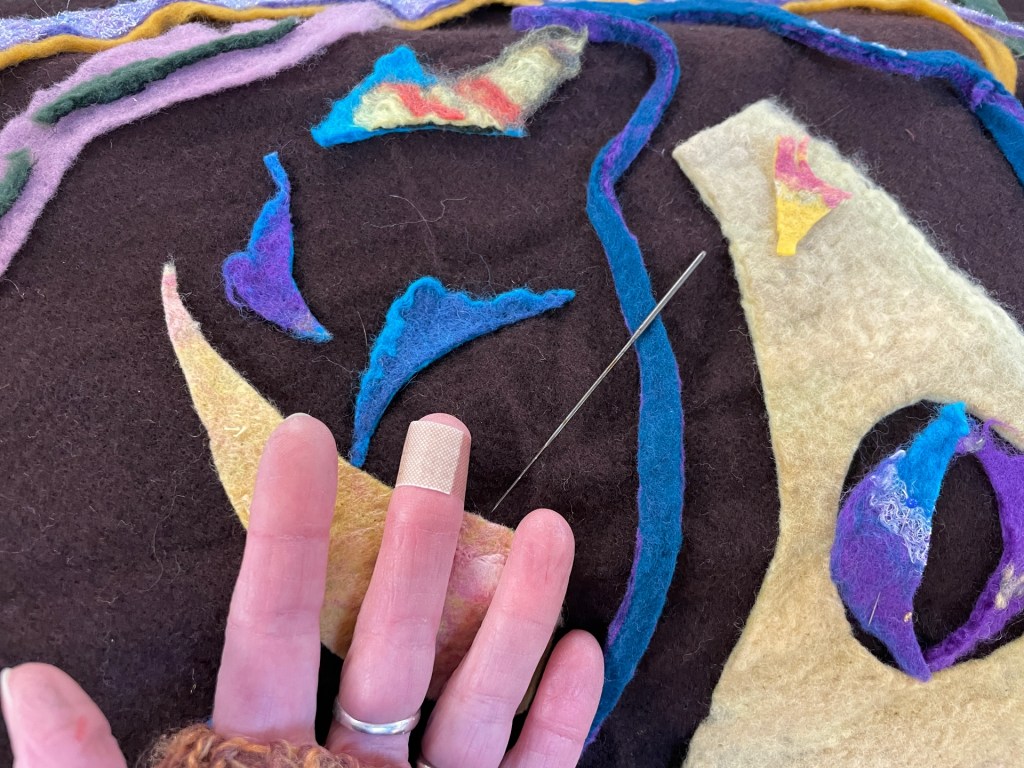 Using glue to tack pieces in place was interesting but did not work that well with felt so I needle felted pieces to hold them in place….stabbing myself in the process. (Yup…me and sharp implements…not a good combination so needless to say I don’t do much needle felting.)