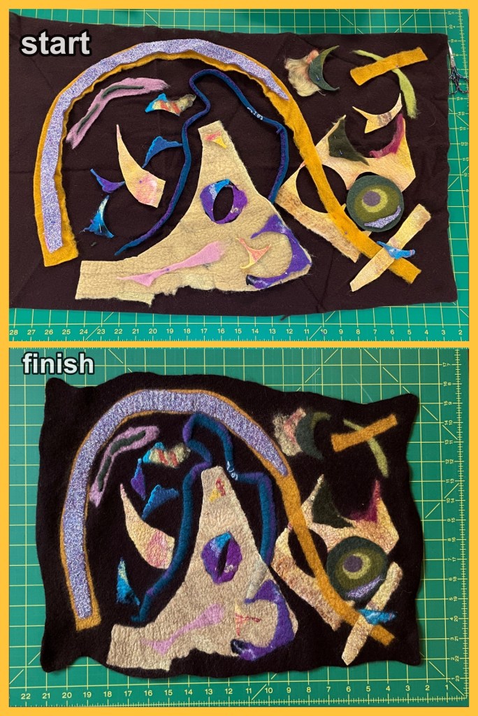 Because I wasn’t sure all the pieces would felt together, once I got home I used thread and yarn to tack the heavier felt scraps to the prefelt backing, then wetted it down and began to roll. My ‘Scrappy’ design shrank about 25% and each of the ‘already felted’ scraps were able to lock into the pre-felt backing.
