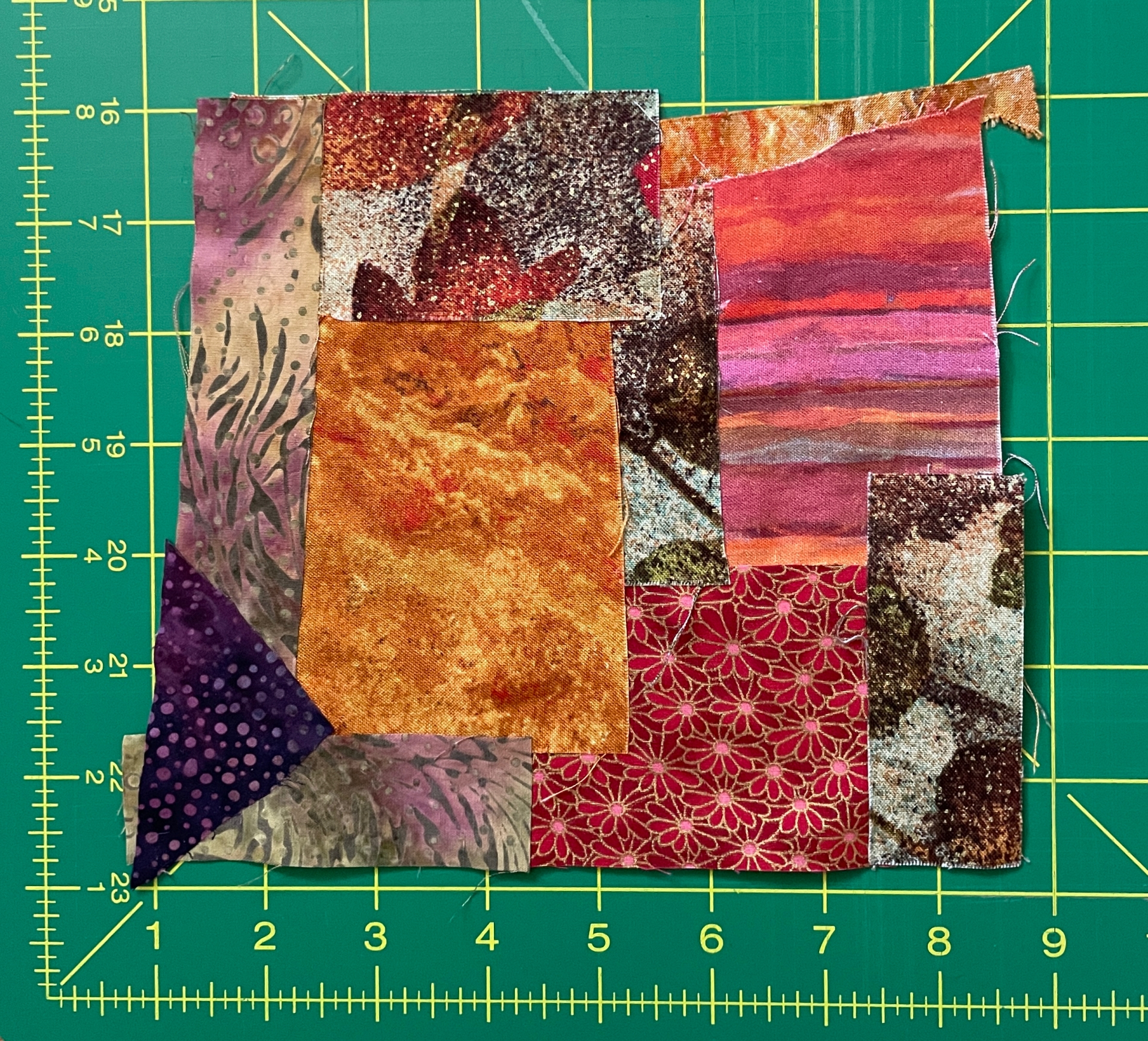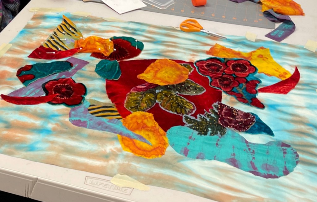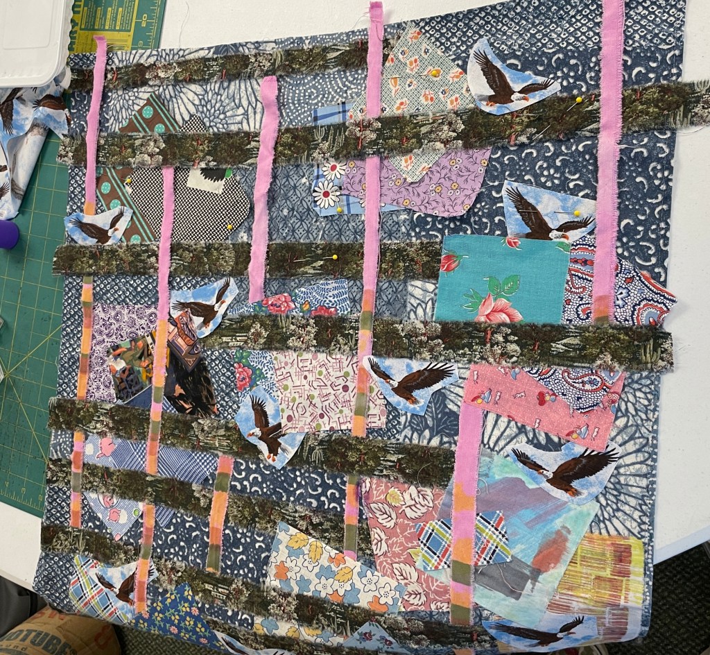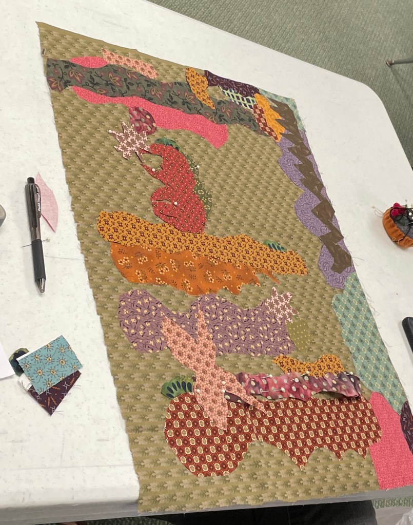 Handwoven fabric is not as easy to save small bits so I don’t have many but I have LOTS of felt scraps! I signed up for the workshop to push the parameters of my creativity and try some new ways to use my scraps. There were 13 in the workshop. Most used commercial sewing/quilting fabric and 3 of us used felt, handwoven fabric, and velvet.