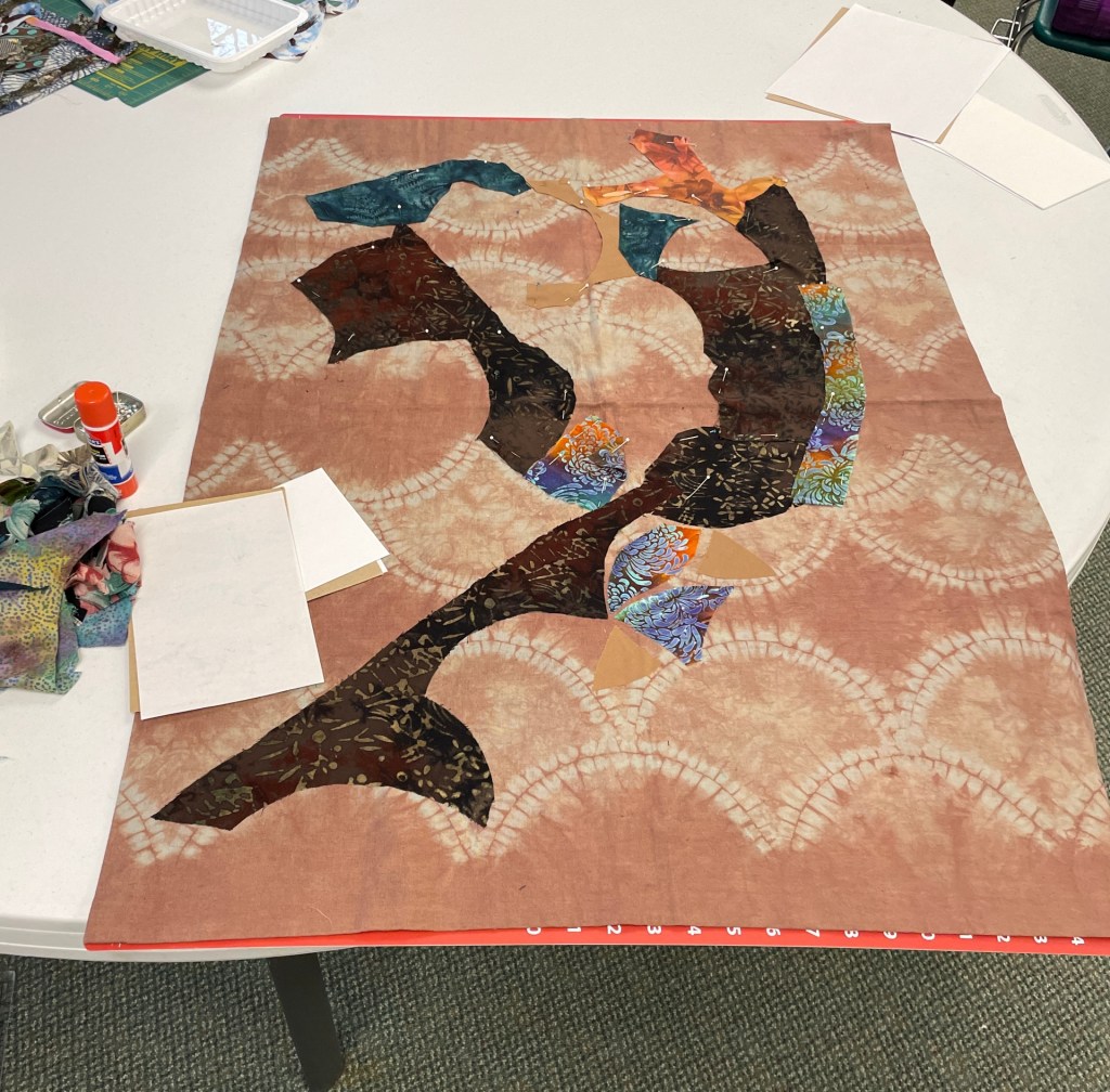 Using glue and pins to hold things in place we laid out our bits and pieces which would eventually be sewn into position.