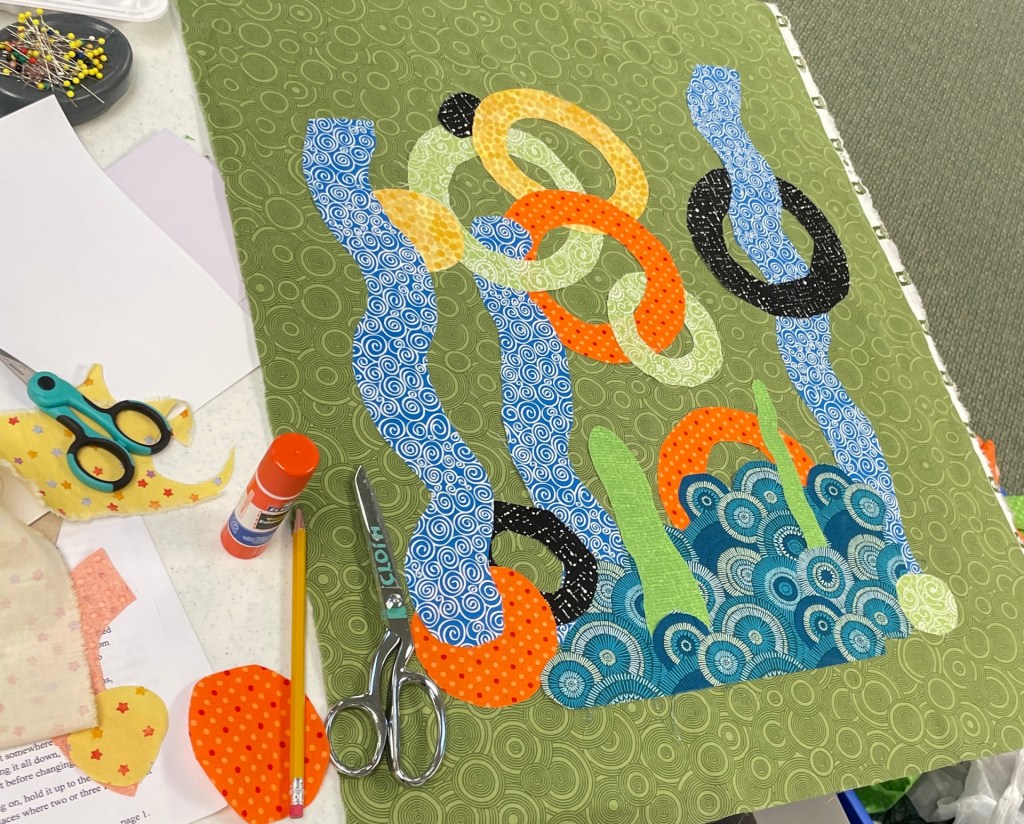 “Drawing from his unique mix of whimsical imagery, abundant textures, and blended techniques, Thom will inspire your improvisational spirit and unlock your sense of play as you turn leftover fabrics into a cohesive new piece. Gather all the odd fabric scraps from your stash to give them new life as an abstract art quilt composition. Finally, a way to put all those little bits to good use!”