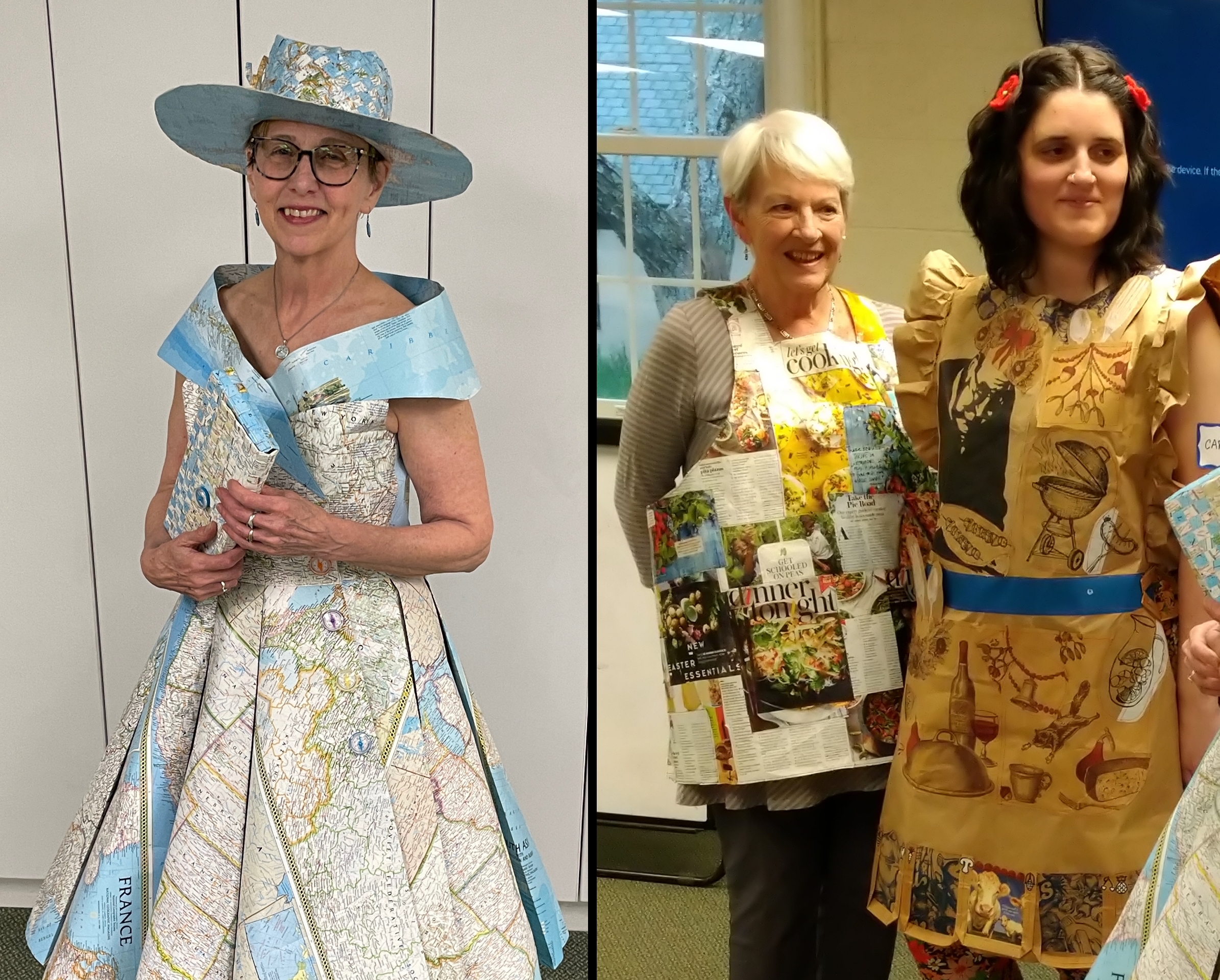 Jennifer Collier [see March 2024 blog] inspired 2 other members to create full size wearable garments. We had a great runway show with Trish Ritchie wearing her kitchen apron made out of pages from Cooking Light Magazine and Carolyn Michaels wearing the pinafore apron Helen Welford made using paper grocery bags.