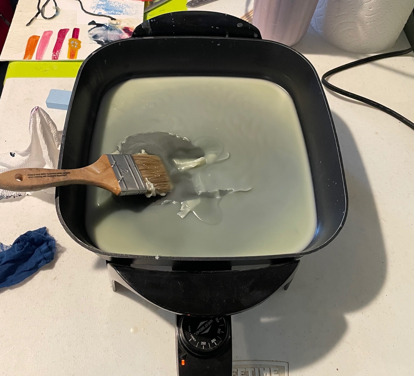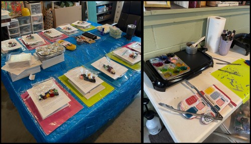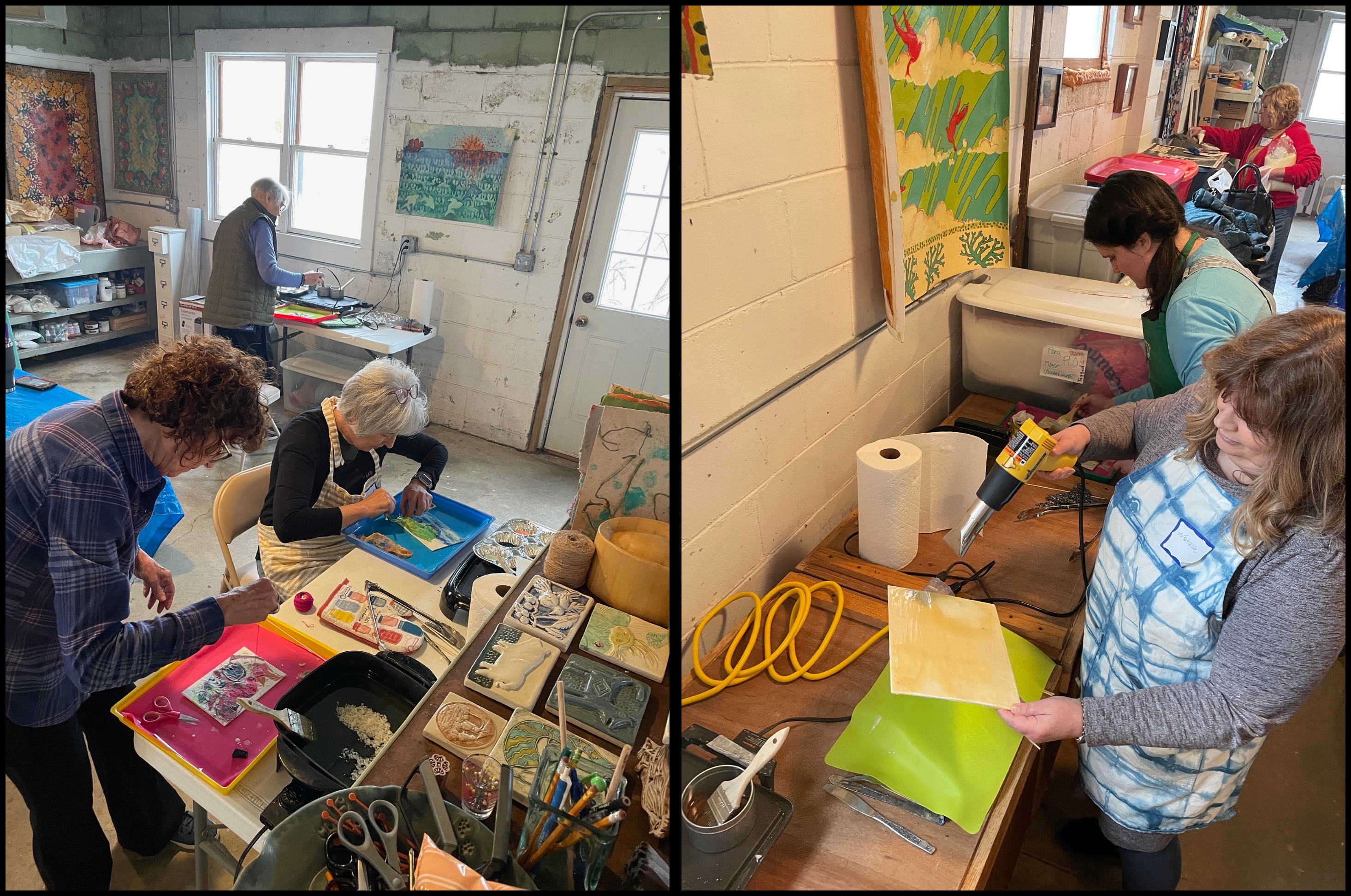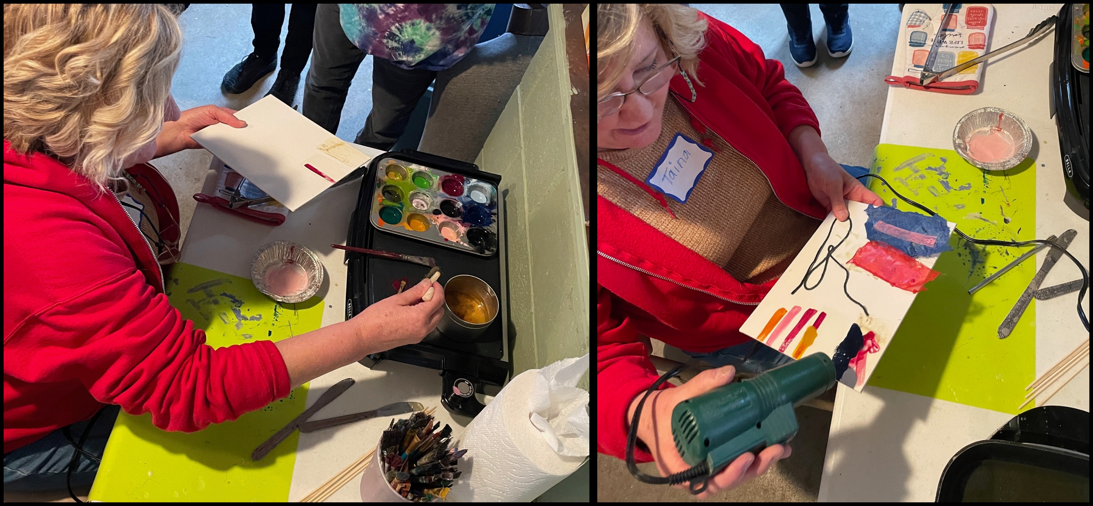Taina demonstrated how to use paint brushes and heat guns to paint the melted wax and how to mix colors. In some ways this is similar to painting with water colors – but one has to work fast because the melted wax hardens quickly!