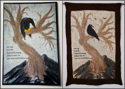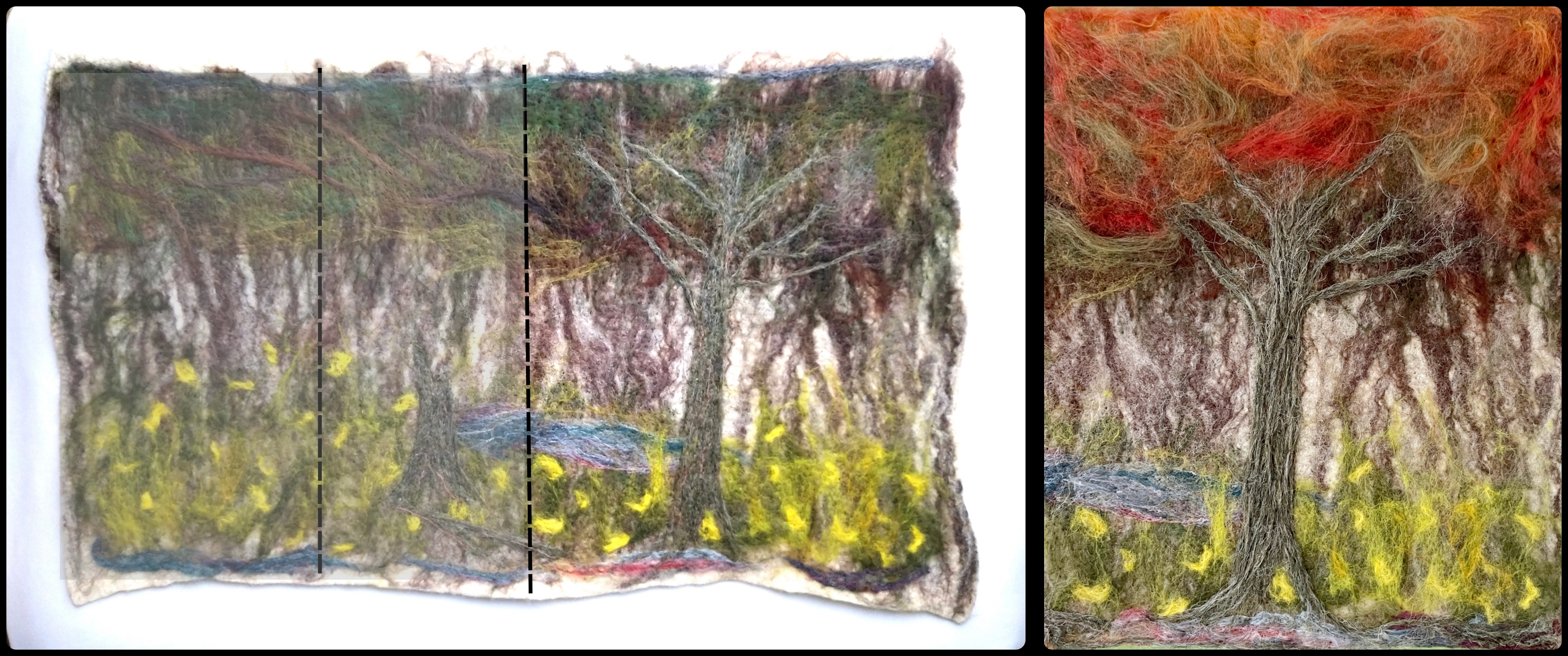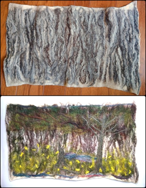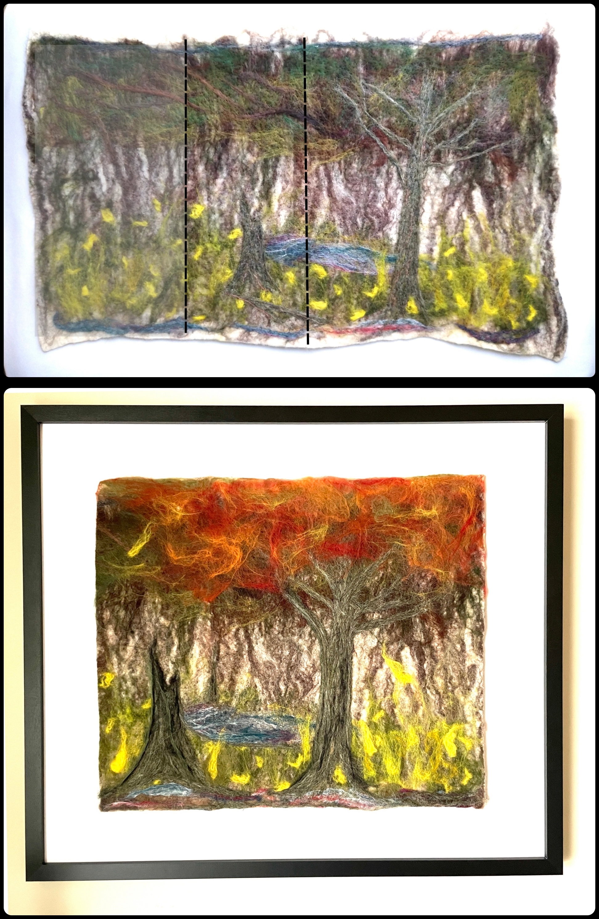Looking at it now it told me I need to keep working on it. I cut the piece in half and focused on the large tree needle felting additional layers to fill out the trunk and add colorful leaves. I like the tree but overall picture needed more.