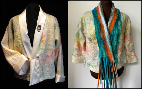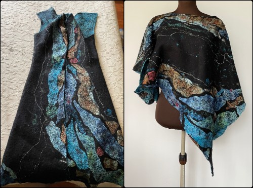 The same has been true with the woven and felted pieces I’ve created. Looking at some of my early felt wall pieces I now see that they need further work. There are shawls, jackets and dresses that a lot of blood, sweat and tears (sometimes literally!) that went into making them and it’s a shame to leave them packed away because they are no longer a style I wear now. I see them hanging in the closet and think how can they be reimagined into pieces that will be worn once again. All of this cultivates my creativity as I think about the solutions.