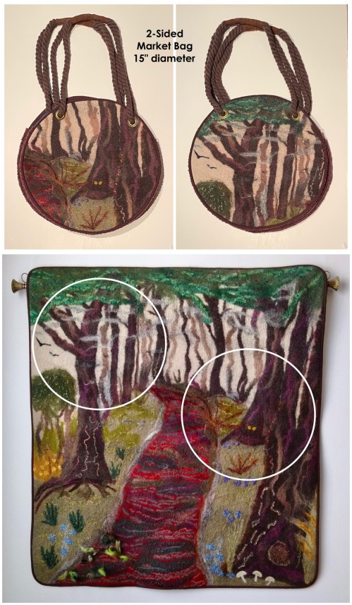 I was reorganizing the storage tubes that hold some of my felt pieces. I pulled out ‘Secret Garden’. It had all started years ago with felting a sample of bicolored roving from a Jacob fleece that ended up as an “OK…now what do I do with it….?” It took several more years to percolate before resulting in ‘Secret Forest’.