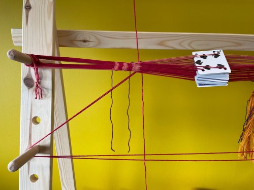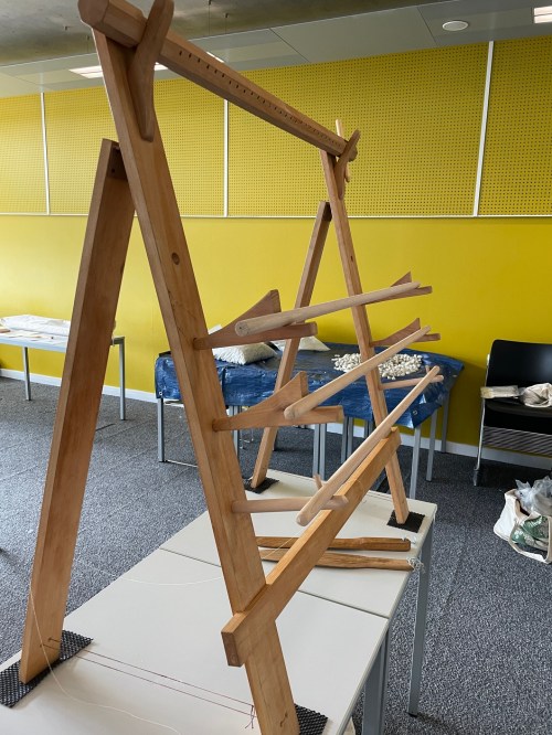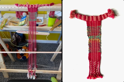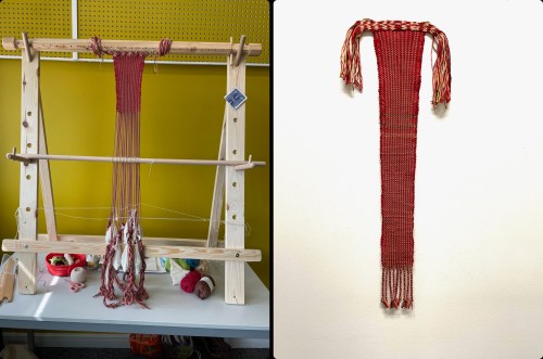 This course is an introduction to and working with a warp-weighted loom. We will talk about the history of these looms. Students will learn basic techniques to produce a woven project – from dressing the loom, planning/designing, and weaving a small project.