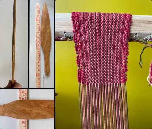 Weaving on a warp weighted loom is different from any other loom. On most looms you beat the yarns down or toward you but a WW-Loom you beat upward using a wooden sword.