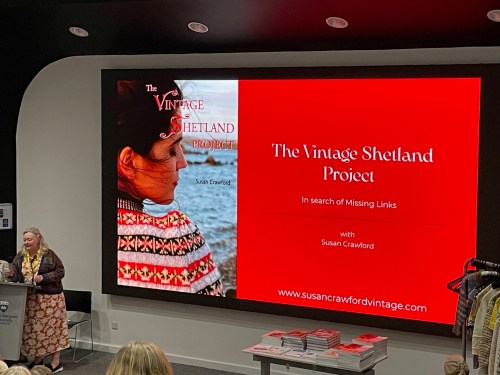 Susan Crawford gave the evening lecture – The Vintage Shetland Project – a celebration of the patterns, colors, and rich heritage of Shetland knitwear, and in particular the pieces held in the Shetland Museum archive.
